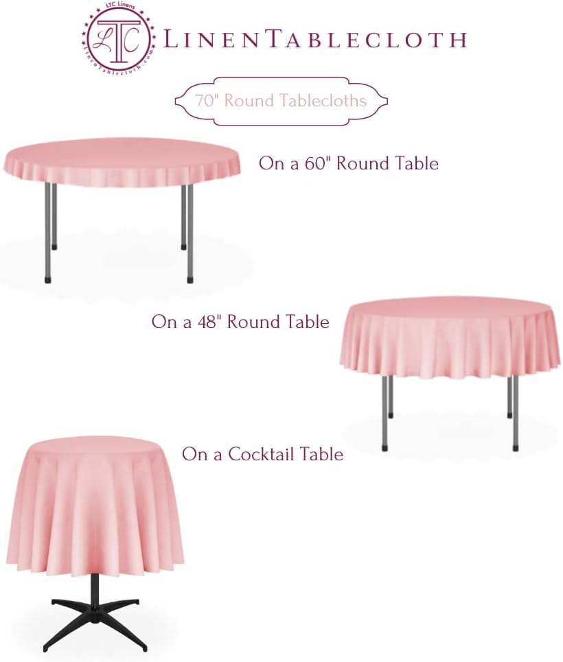 - 70 in. round tablecloths provide a 22 in. drop on standard 48 in. round tables.