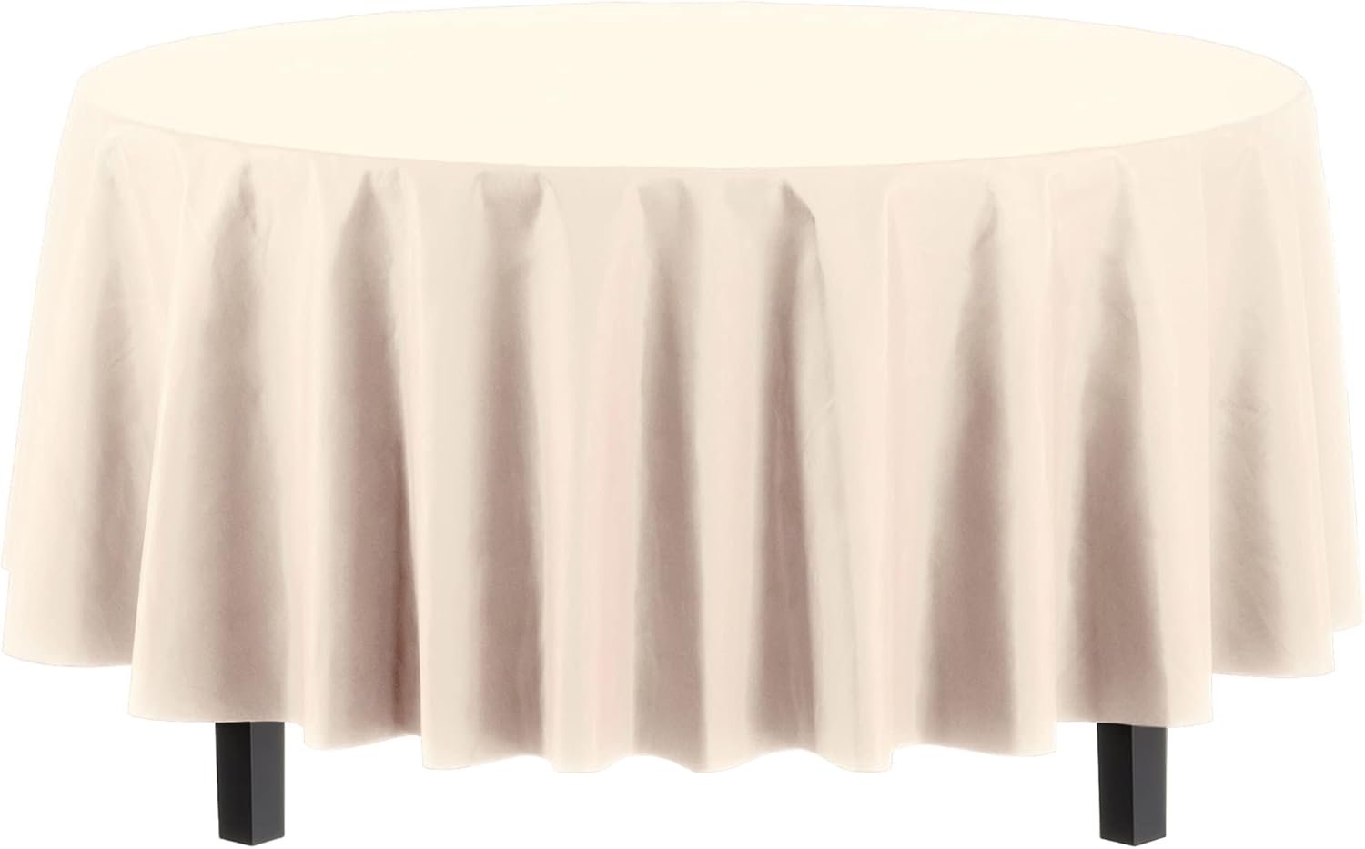- PREMIUM QUALITY PROTECTION: This 12 pack of 84 in. Ivory Round plastic tablecloths will cover any table up to 7 feet. Unlike your typical paper table clothes these disposable table covers for parties are spill and waterproof!!!