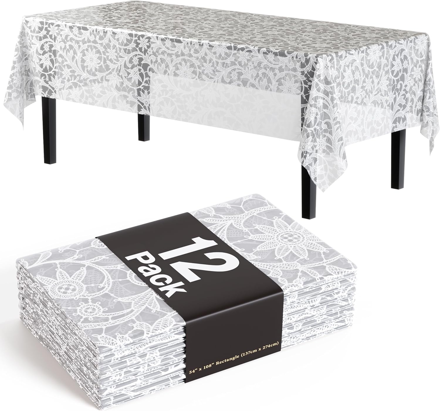 - Includes: This 12-pack of transparent white lace table cloth rectangle table coverings offers elegant protection for your furniture. Each white table cloth rectangle measures 54" X 108", making it ideal for standard tables. These clear plastic table cloth disposable covers combine functionality with beauty. Being disposable tablecloth yet fancy flower tablecloth at the same time.