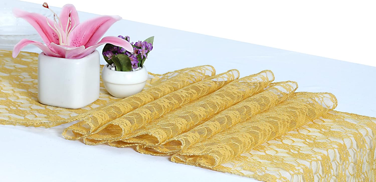 MDS Pack of 15 Wedding 12 x 108 inches Lace Table Runner for Wedding, Decorations for Birthday Parties, Banquets, Graduations, Engagements, and Runners fit Rectangle, Round Table- Gold