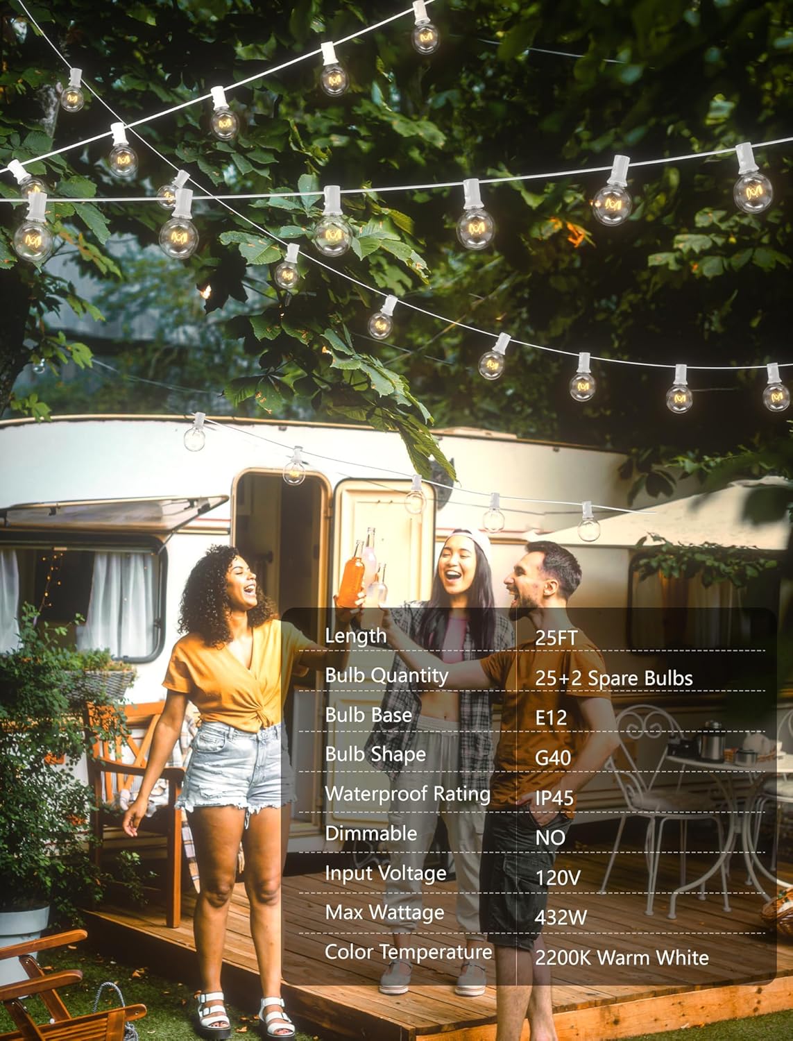 - 💡 End to End Design: 6" lead with male plug, 12" spacing between bulbs, 6" tail with female connector, total 25 feet length. The male plug contains a spare fuse. End to end connectable string lights, total strand load of a socket power supply cannot exceed 432W, so patio string lights can be connected up to 3 strings.