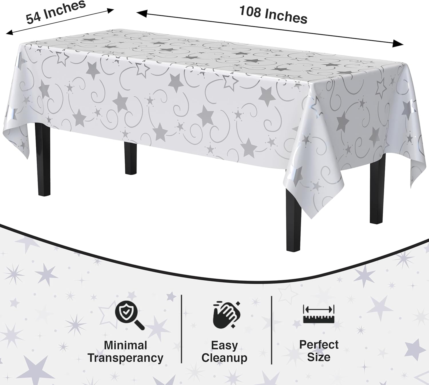 - Includes: This 12-pack of Silver Star on white back Tablecloths comes with Disposable Rectangle Tablecloths measuring 54" x 108". These Rectangle Table Covers are perfect tablecloths for rectangle tables, offering a stylish Silver Star Table cloths design for any celebration, keeping your tables clean and protected.