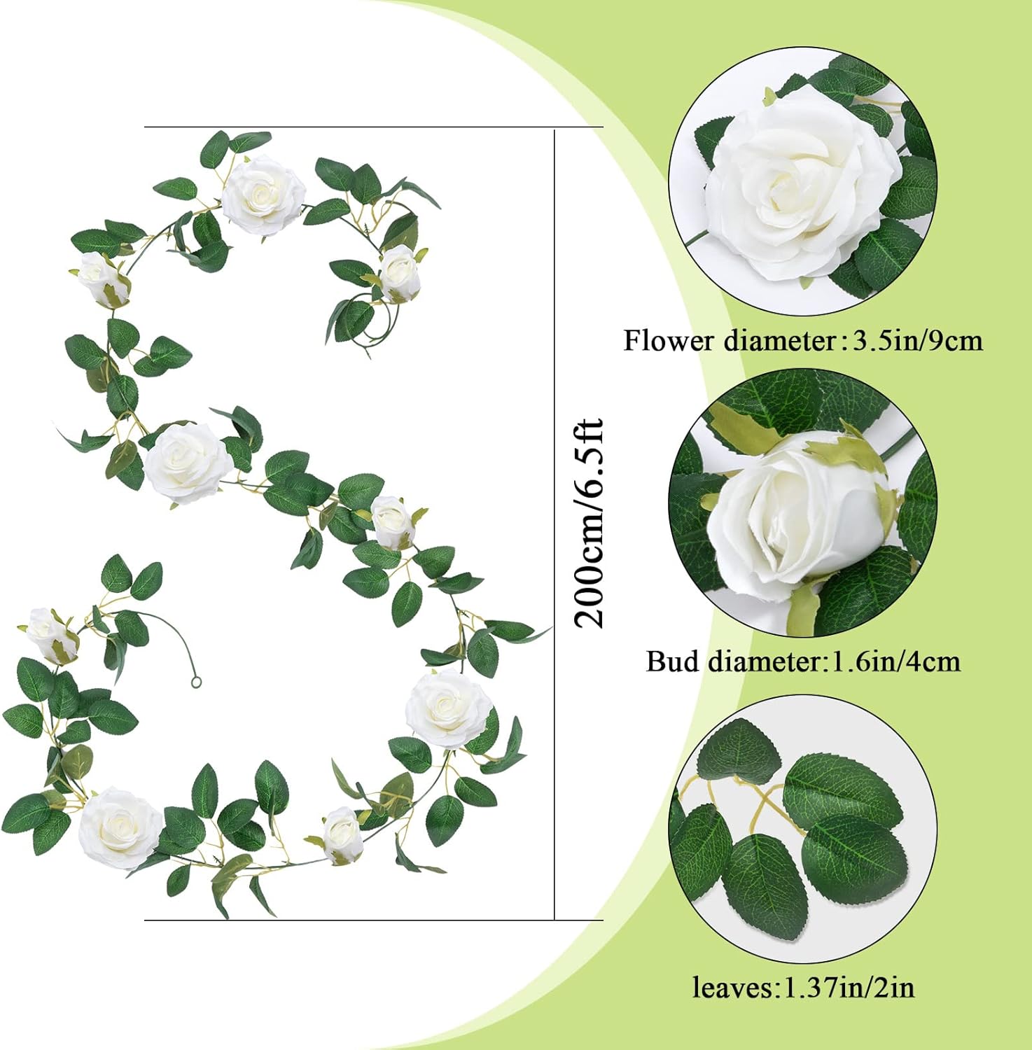 - Package Included: 3pcs White rose vine garlands. Each is about 6.5 feet long. Each garland has 4 rose blossoms, 5 buds and 102 leaves. Flower diameter: 3.5 Inch, Bud diameter: 1.6 Inch