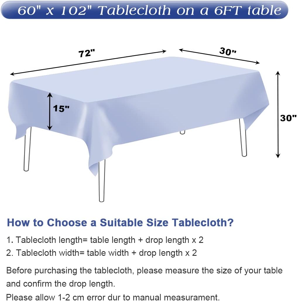 - Size: Please measure the size of your table before purchasing. The length of a floor-touching tablecloth should be the length of the table plus twice the height of the table. The pictures are for your reference only. Please refer to the size chart to select the most suitable tablecloth.