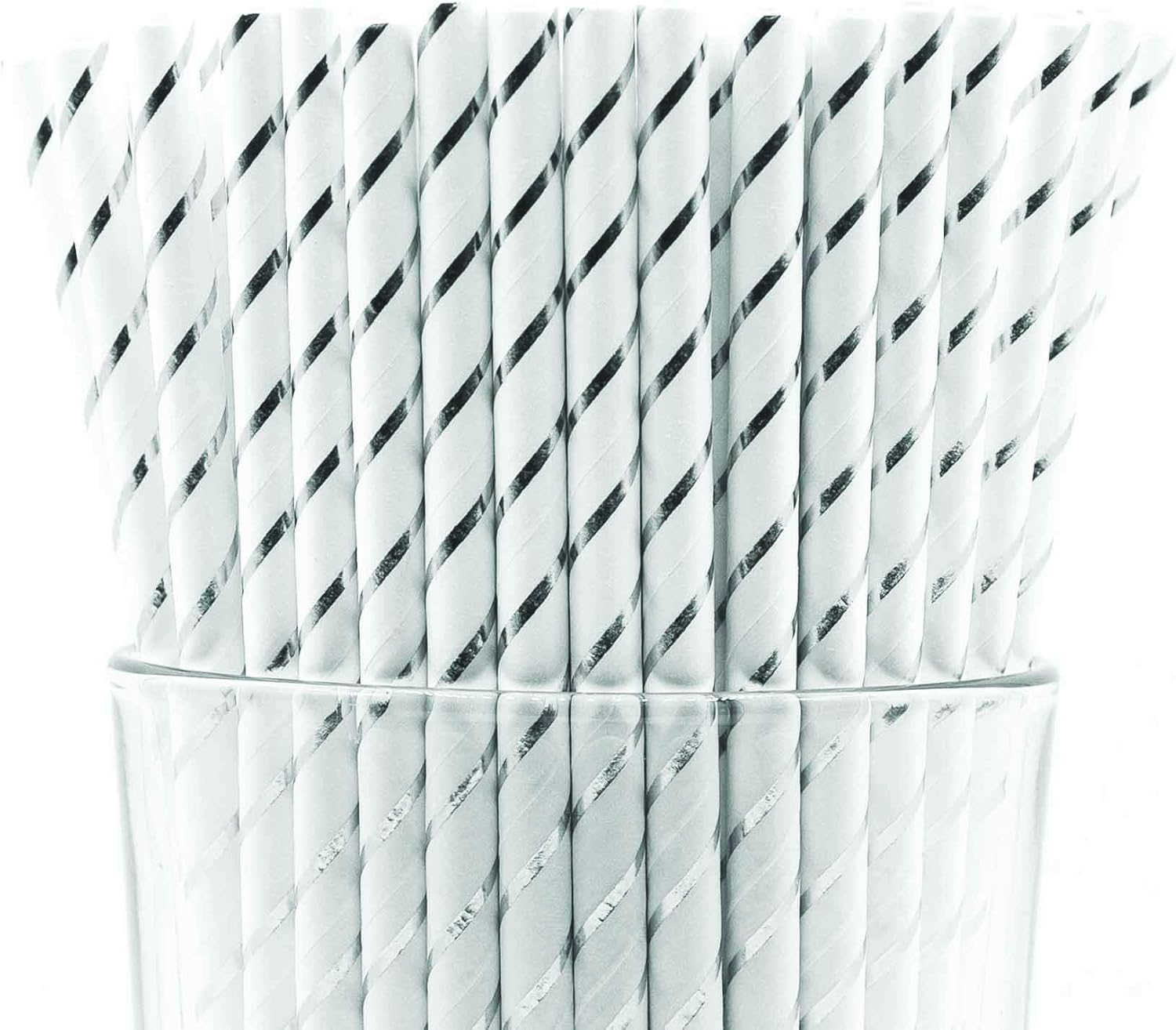 - Pack of 300 Silver Stripes Foil wrapped paper straws that are 7.75” long and have a diameter of 0.25”. Made with 4-ply paper which translates into thicker and more resilient straws that won’t wilt or change shape in both hot and cold drinks.