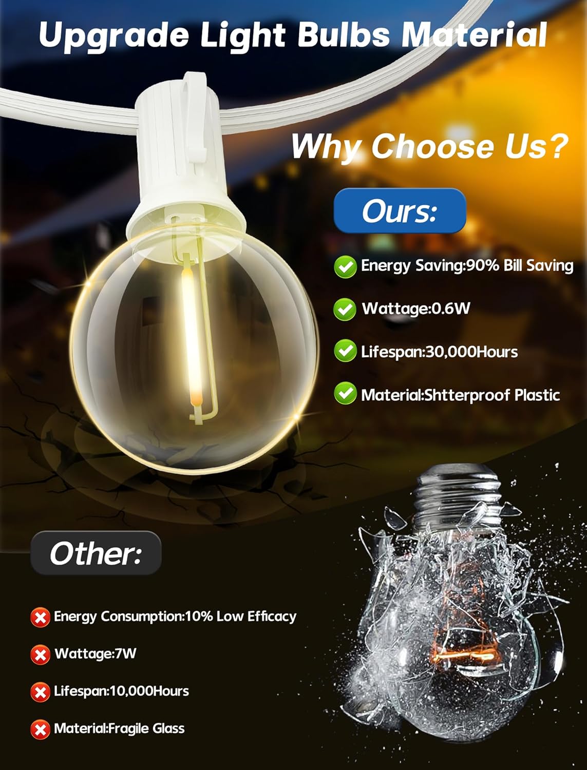 - Shatterproof and Energy Saving: The bulb string lights are made of high-quality shatterproof material that can withstand accidental drops and impacts. Each 0.6W LED bulb saves more than 90% energy than incandescent bulbs.A service life of up to 20,000 hours reduces maintenance costs for frequent lamp replacement. outdoor globe lights are the perfect convenient and versatile lighting for patios, decks, weddings, party, umbrellas, backyard, pergola etc