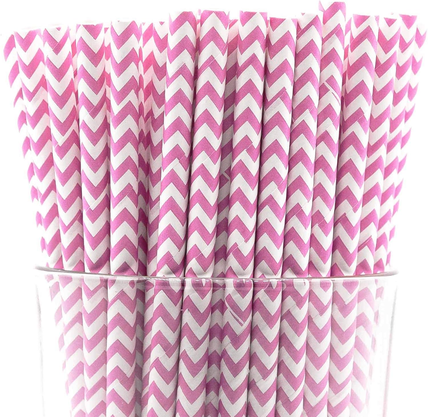 - Pack of 150 Baby Pink Chevron paper straws that are 7.75” long and have a diameter of 0.25”. Made with 4-ply paper which translates into thicker and more resilient straws that won’t wilt or change shape in both hot and cold drinks.