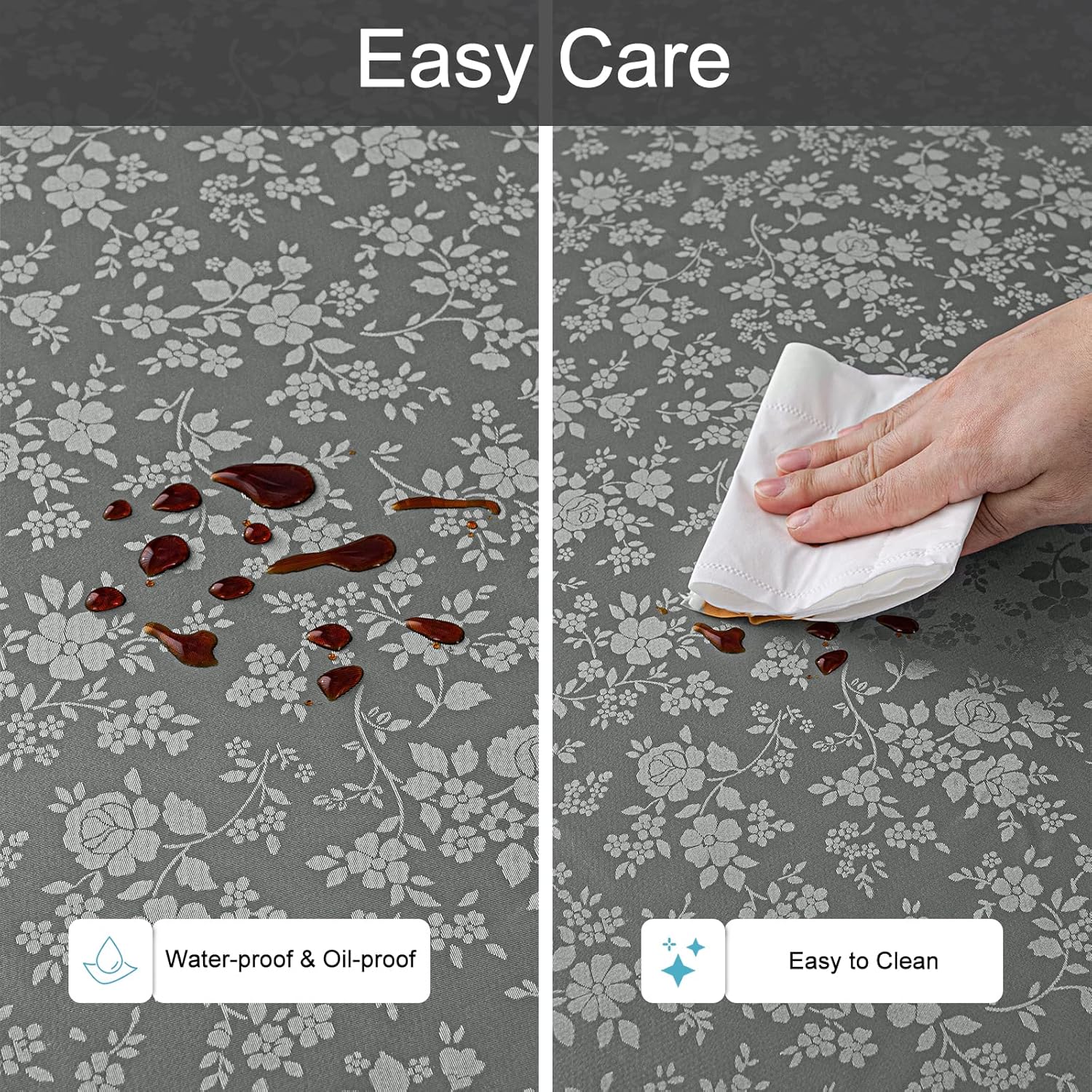 - [Easy Cleaning] The surface of the Smiry tablecloth is impervious to water and spills, allowing you to effortlessly wipe away liquids with a damp cloth or napkin. For thorough cleaning, simply toss it in the washing machine with cold water and then dry it on a gentle cycle or under the shade.