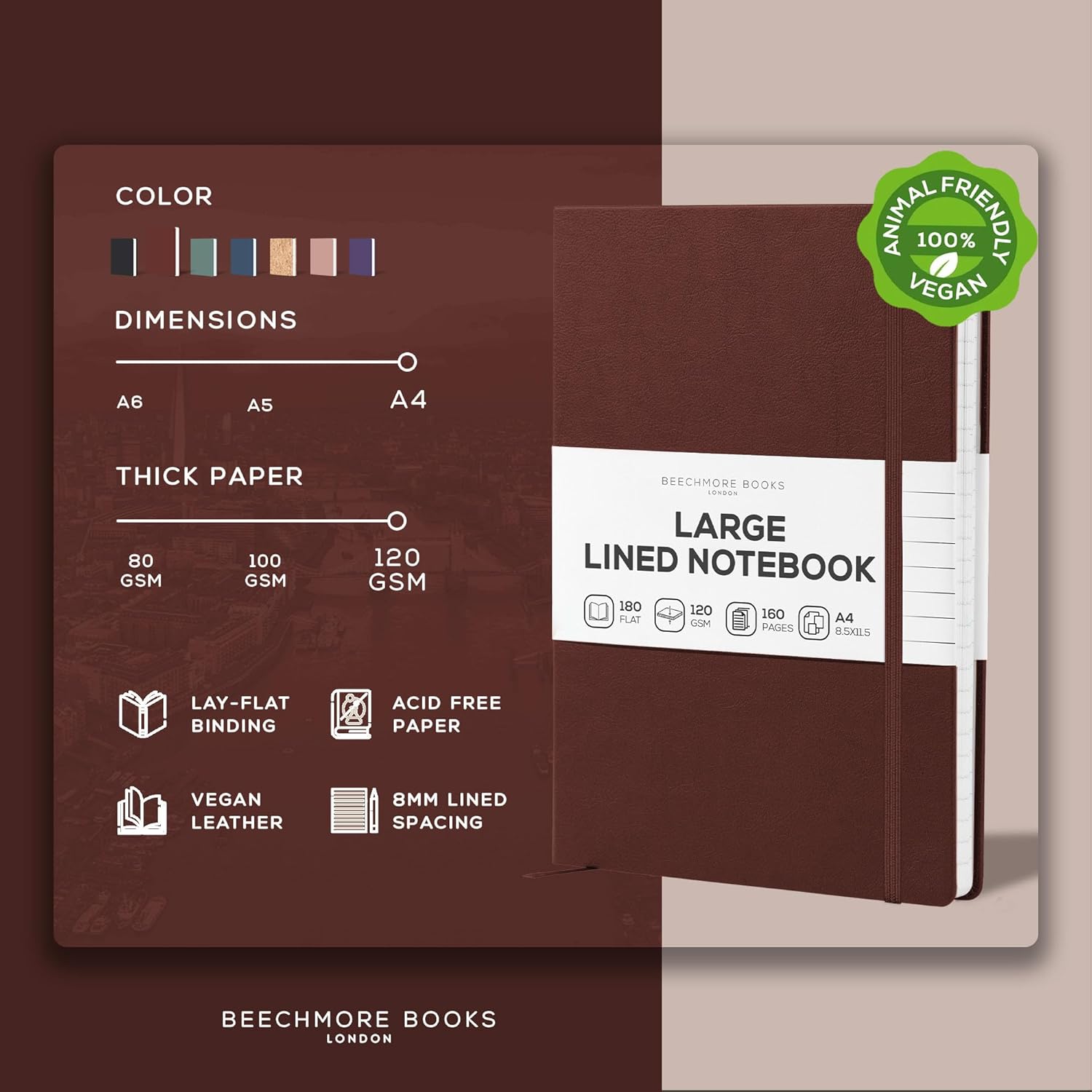 BEECHMORE BOOKS Lined Journal Notebook, 8.5 x 11.5 inch, A4 160 Lined Pages, Hardcover Leather Journals for Women, Men, Writing and Notebooks for Work - 120 GSM Thick Paper, Gifts Box Included (Chestnut Brown)