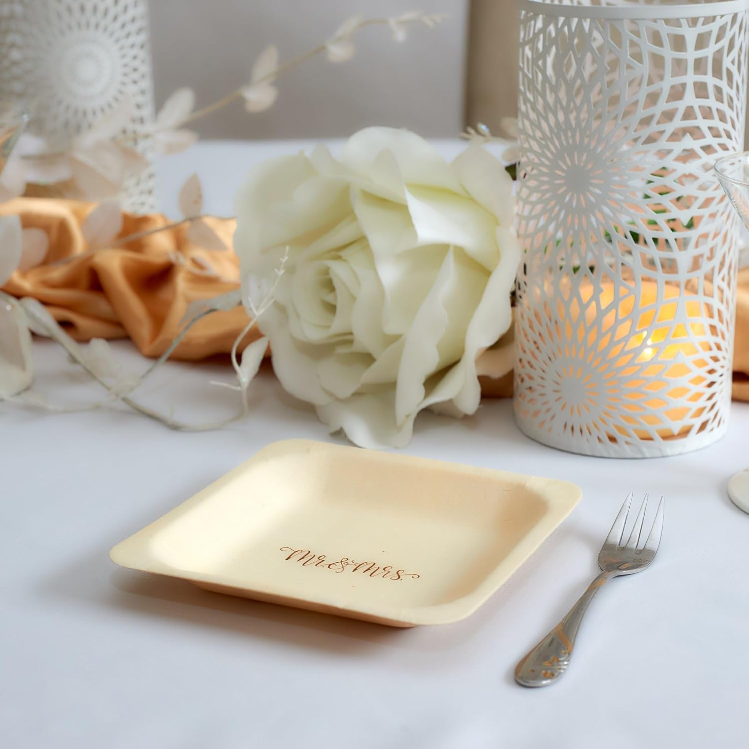 - 🎂 You’ve never seen fancy disposable plates like these! Featuring "Mr & Mrs" in beautiful hand-lettered calligraphy, these plates are sure to add an unforgettable touch to your special day.