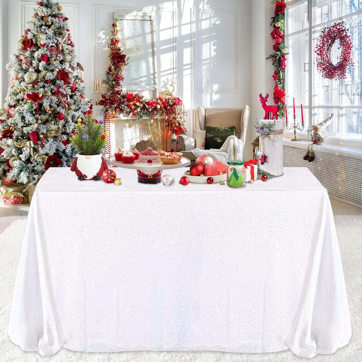QueenDream Sparkly Sequin Tablecloth - White Table Cloth 50x80 Inches Rectangle Table Overlay Fabric for Birthday Parties Baby Shower Decoration