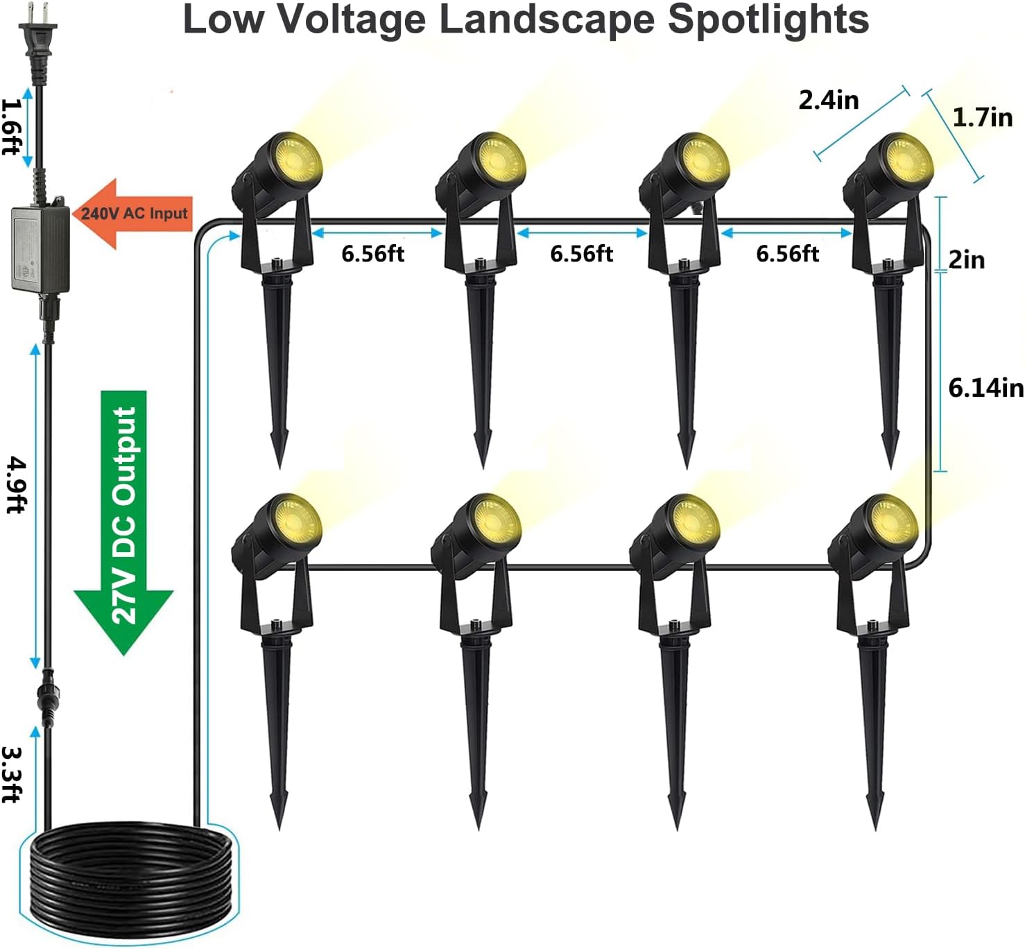- 【Easy to Install, Plug and Play】Wired landscape lighting kits are includes 8 spot lights, 1 transformer and cables for fast and easy set up to brighten your yard. Just stick into the ground or use the included screws to mount on the wall and plug it into outlets, simple to install, hassle-free to use