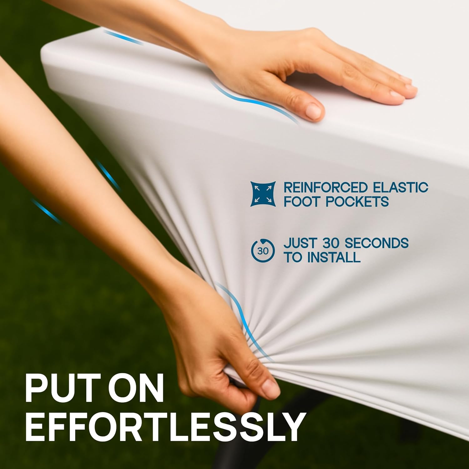 - Quick and Easy Setup: Transform your table in just 30 seconds with our white table cloth rectangle! Wrap the 8 ft table cloth rectangle table around your 8-foot table, slip the legs into the elastic pockets, and achieve a flawless look effortlessly