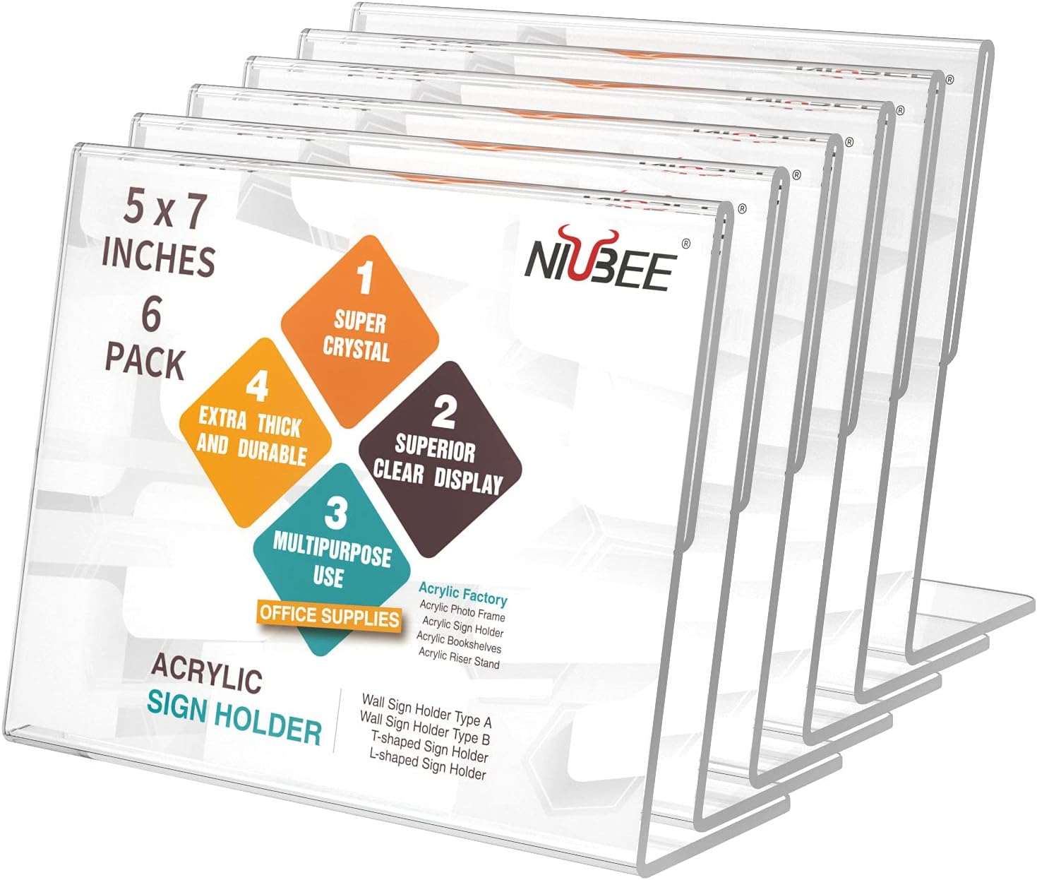 NIUBEE Slanted Back Acrylic Sign Holder 7 x 5 Inches, Clear Plastic Sign Holder Paper Display Table Stand for Office, Store, Restaurant -Horizontal (6 Pack)