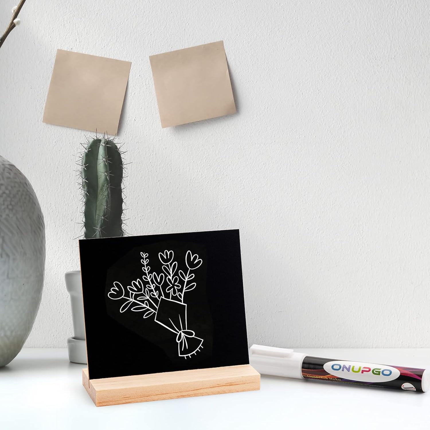 - 6 Removable mini chalkboard sign with wood bases + 1 liquid chalk marker.