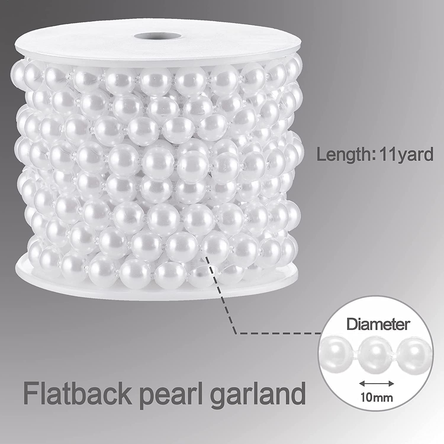 Flat Pearl Garland String 11 Yards, 10MM Half-Round Beaded Spool Roll Crafts for Wedding Decoration (White)