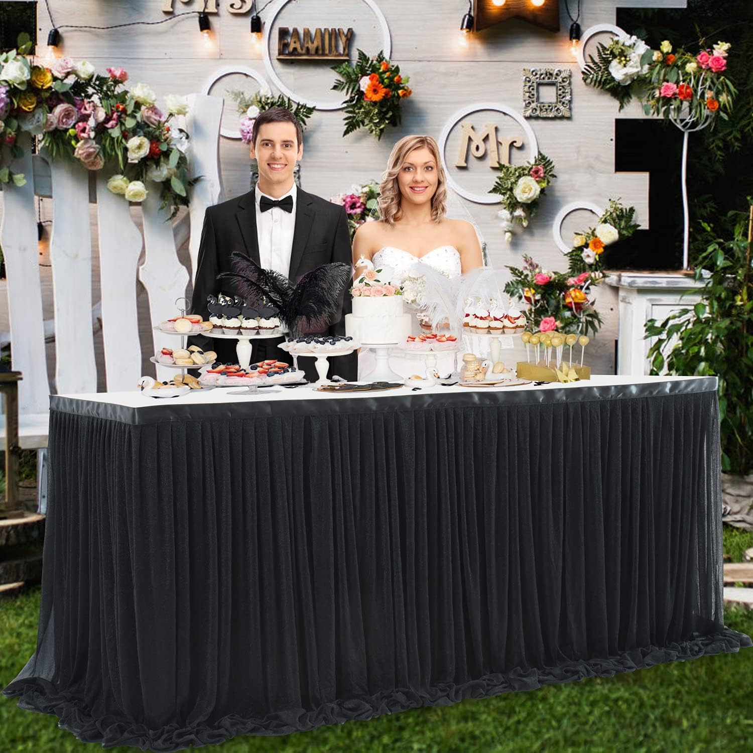 - More usages: 1.all black tulle are naturally drooping, making your party more colorful.2.Black tulle and black tulle can be freely cross-bundled together, and decorated with flowers, lights, balloons, etc., making your indoor and outdoor birthday party wedding baby shower more romantic and elegant.There are more usages waiting for you to show.