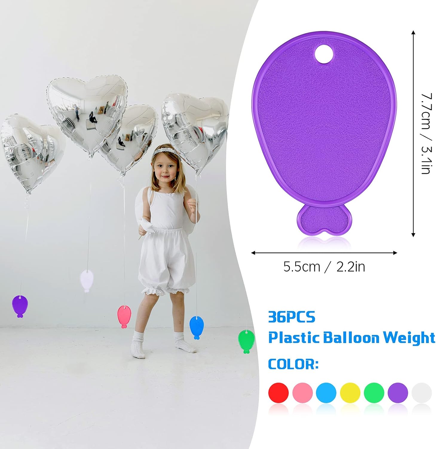 - Included Components : The package comes with 36 pieces of colorful plastic balloon weights in different colors. Each weight measures about 55 x 78 mm/ 2.2 3.1 inches and has a little hole on the top for tying balloons. colors include yellow, green, blue, white, red, purple, pink. The package comes with 36 pieces of colorful plastic balloon weights in different colors. Each weight measures about 55 x 78 mm/ 2.2 3.1 inch… See more