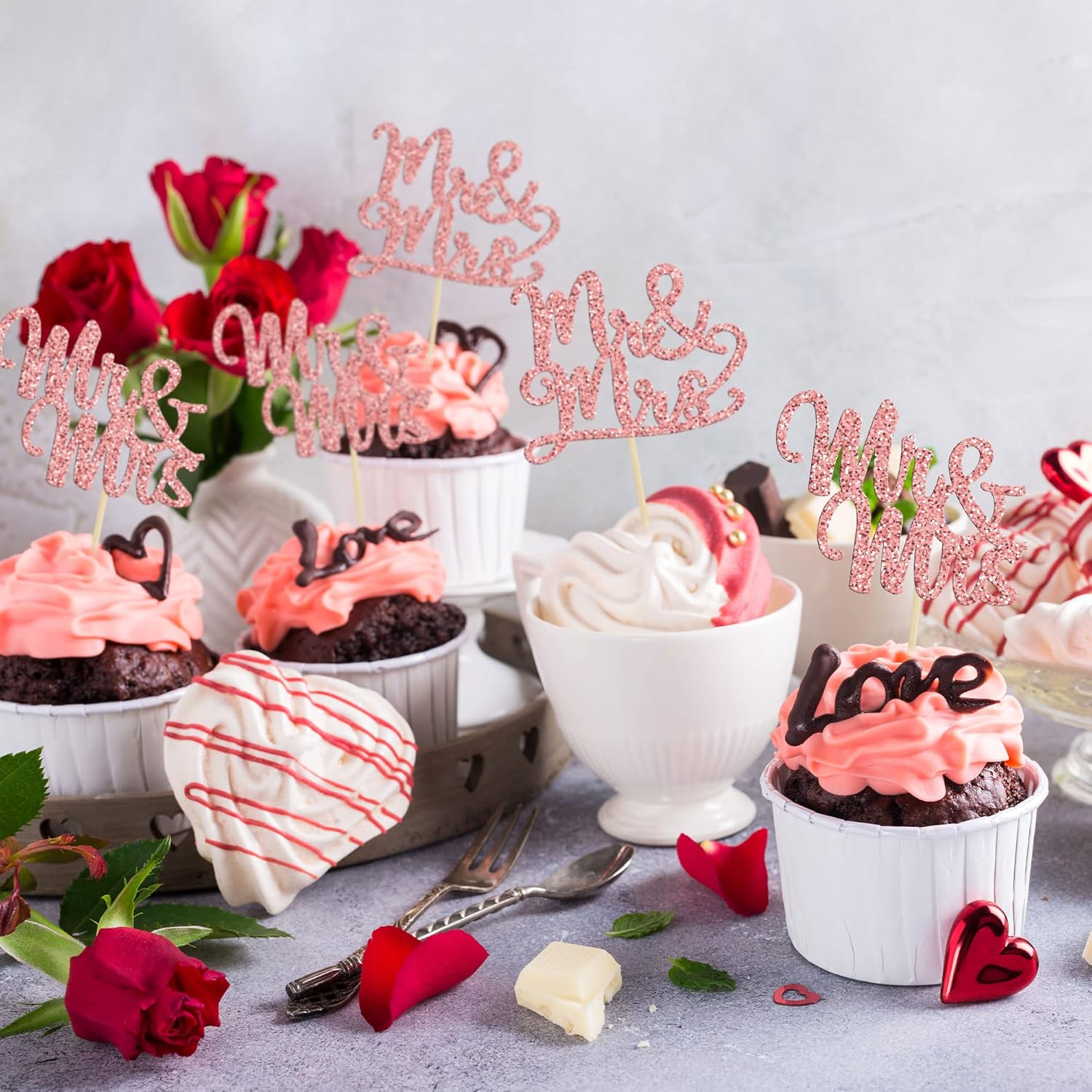 Gyufise Rose Gold Mr & Mrs Cupcake Toppers Love Cake Decorations for Wedding & Bridal Shower Party Supplies