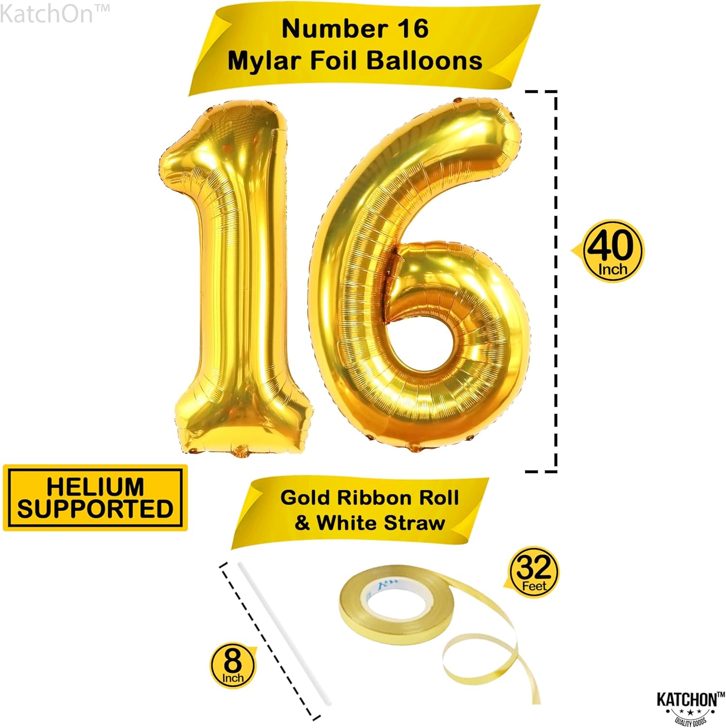 - GIANT SIZE : 40 INCH | LUXURIOUS SHINY METALLIC BALLOON : Celebrating your happy 16th birthday decorations boy or girl? This Giant Sweet 16 Balloons Gold or Gold 16 balloon numbers is size of 40 Inch ideal for sweet 16 decorations gold or for 16th anniversary. Happy Birthday Sweet 16 gold birthday decorations comes with 8 inch white straw and 32 foot ribbon roll. Perfect for your sweet 16 birthday decorations for boys and girls, sweet 16 party decorations gold and gold sweet 16 decorations