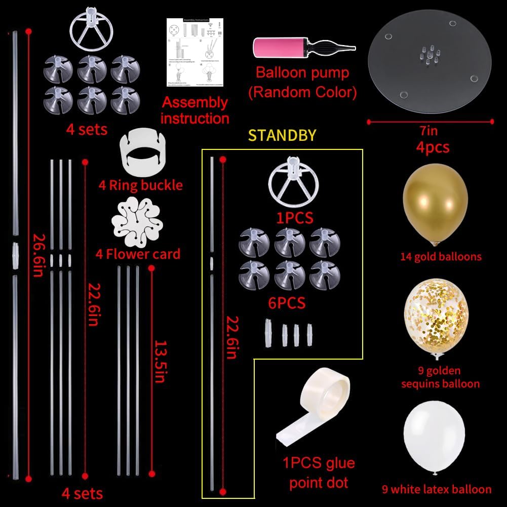 - Package Includes: The balloon stand kit includes 4 reusable balloon centerpiece table decorations and 12 inch 32 pcs Latex Balloons (14 gold balloons,9 white balloons,9 gold confetti balloons),glue point dots,balloon pump,balloon clips,and tie tool.You don’t need to waste money to buy balloons