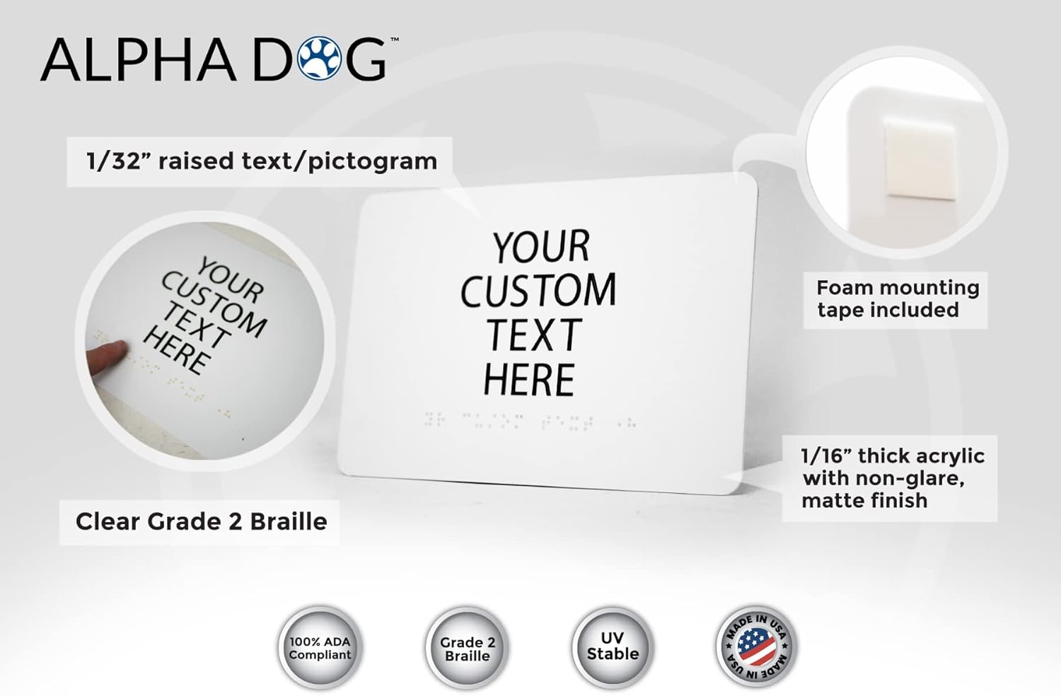 ALPHA DOG ADA SIGNS Custom ADA Compliant Braille Sign, 6"x9" Room Identification Plaque, Tactile Text, Raised Letters, Personalized 4-Line, Indoor/Outdoor, USA-Made (White)