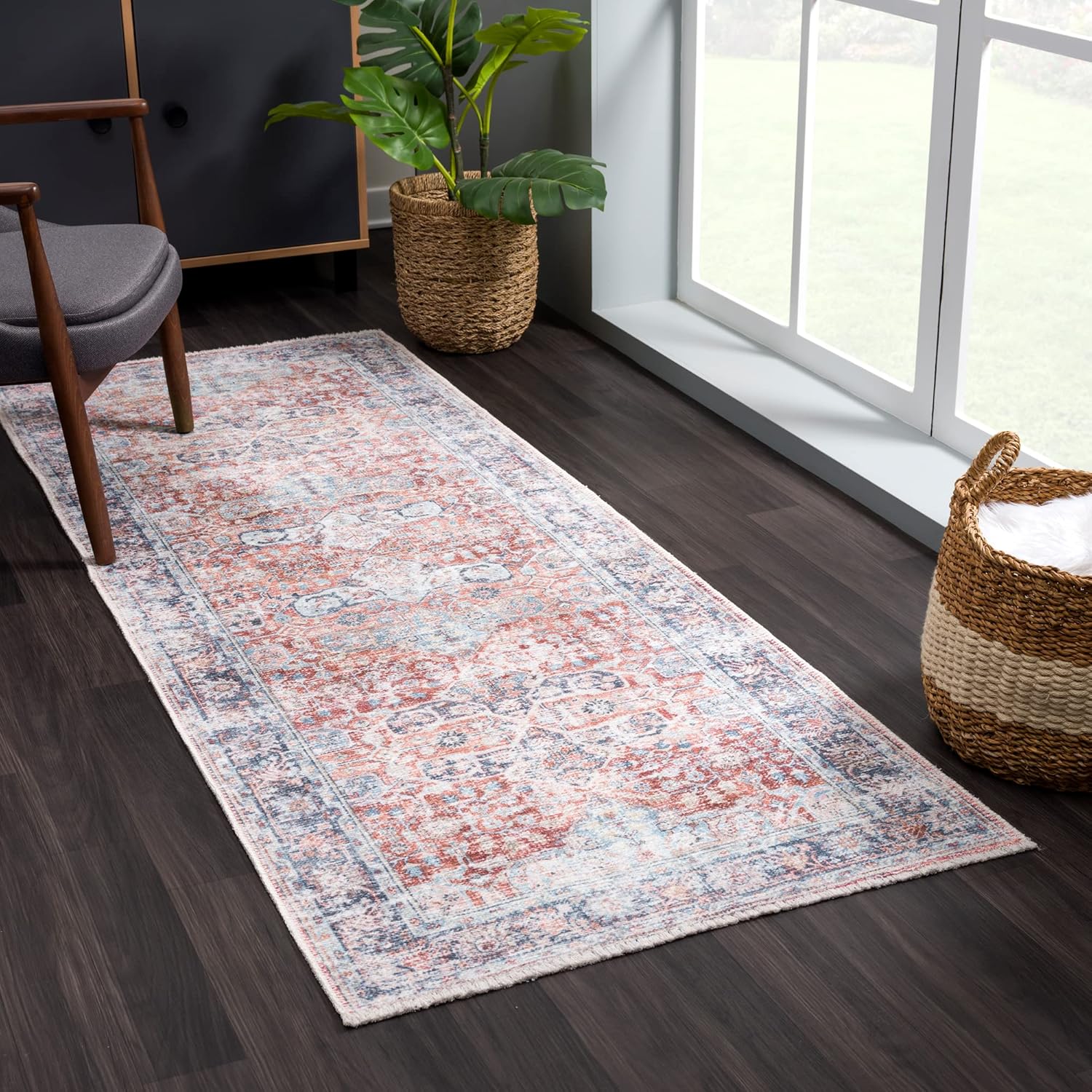 Bloom Rugs Caria Washable Non-Slip 12 ft Runner - Brick/Dark Blue Traditional Runner for Entryway, Hallway, Bathroom, and Kitchen - Exact Size: 2'6" x 12'
