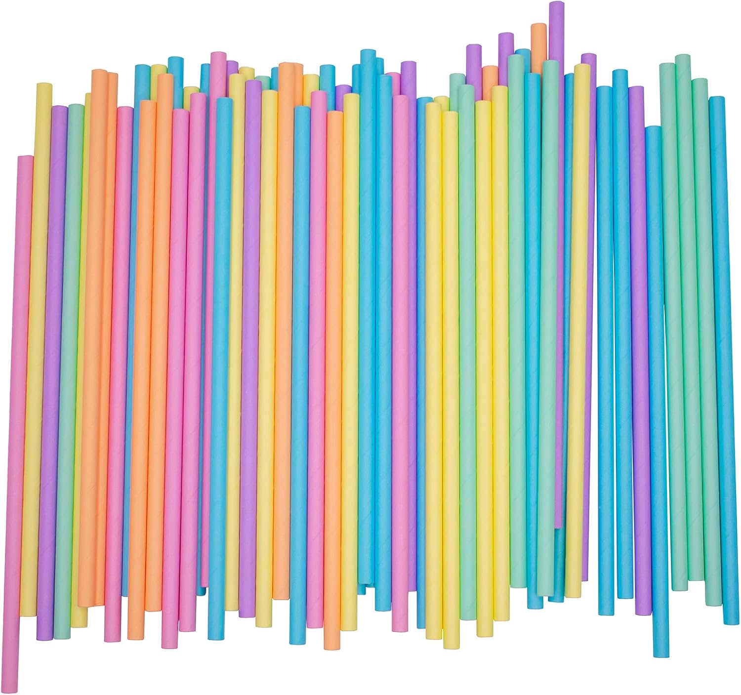 - Pack of 300 Assorted Pastel Orange, Purple, Pink, Blue, Green & Yellow wrapped paper straws that are 7.75” long and have a diameter of 0.25”. Made with 4-ply paper which translates into thicker and more resilient straws that won’t wilt or change shape in both hot and cold drinks.