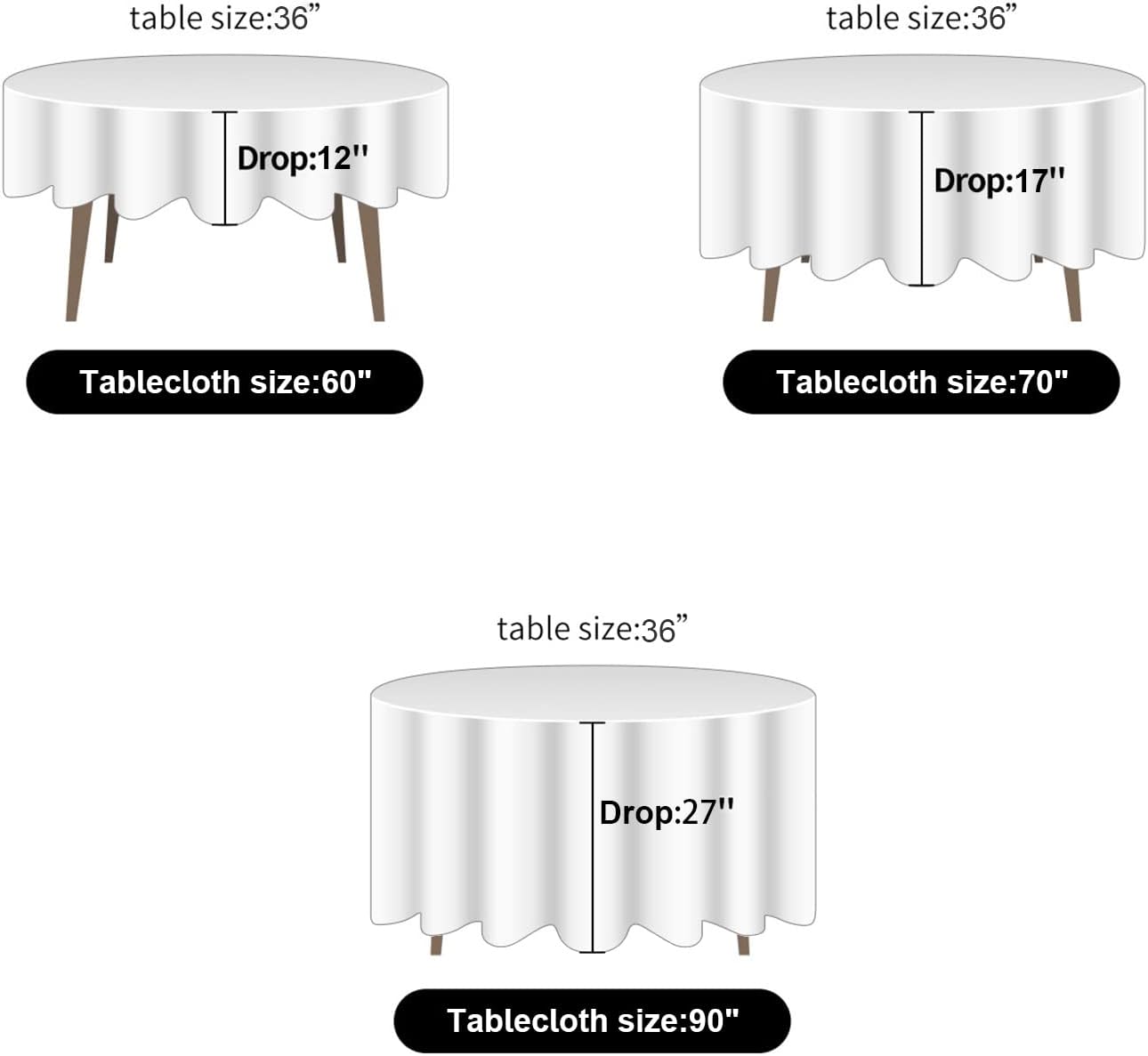 - 2 PACK SET, MORE ECONOMICAL: Each pack include 2 pcs of tablecloth, measuring 60” diameter each. Durable for repeat use, cheaper than renting.We also have 6 pack set and 12 pack set,which will save more.