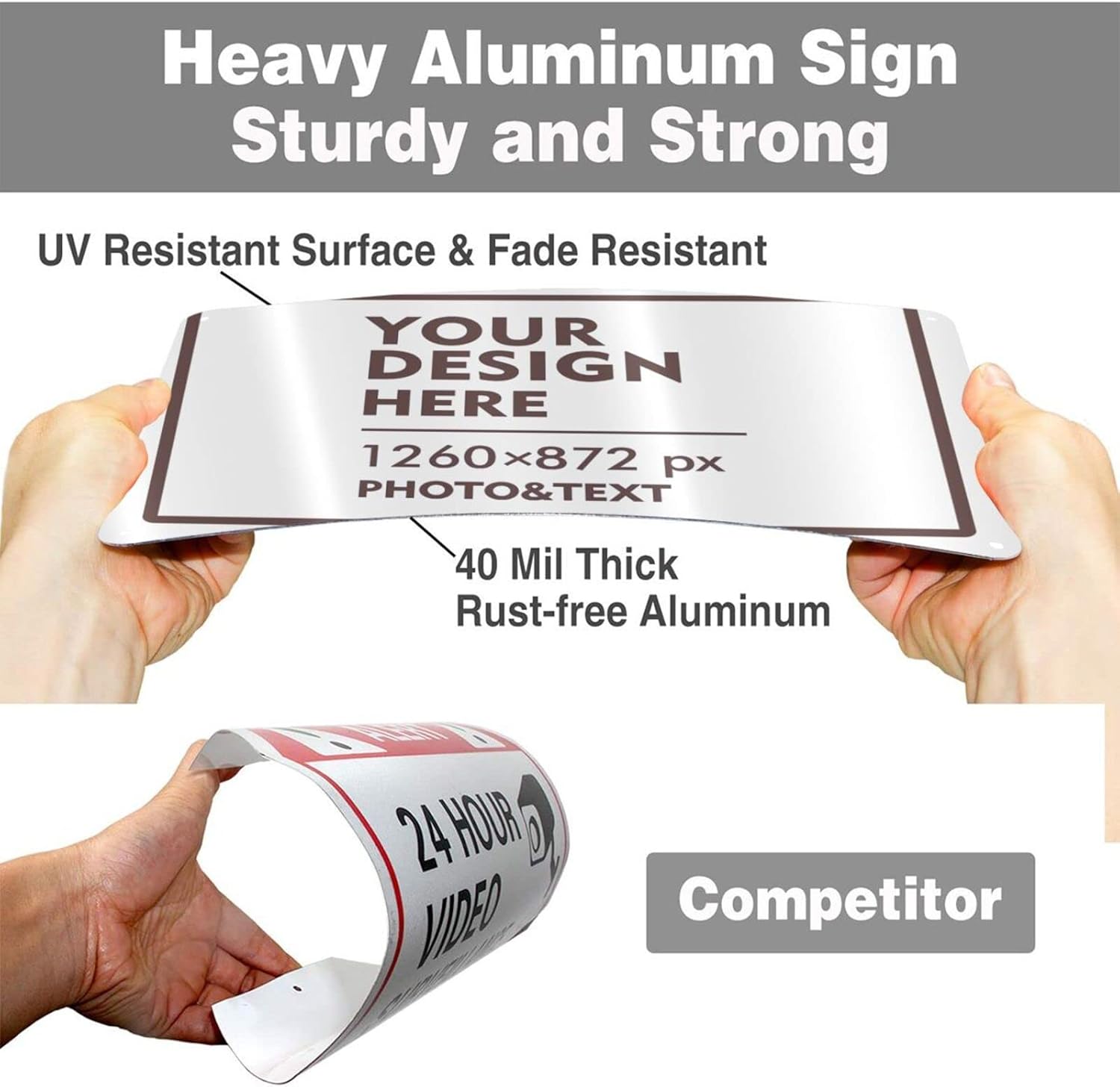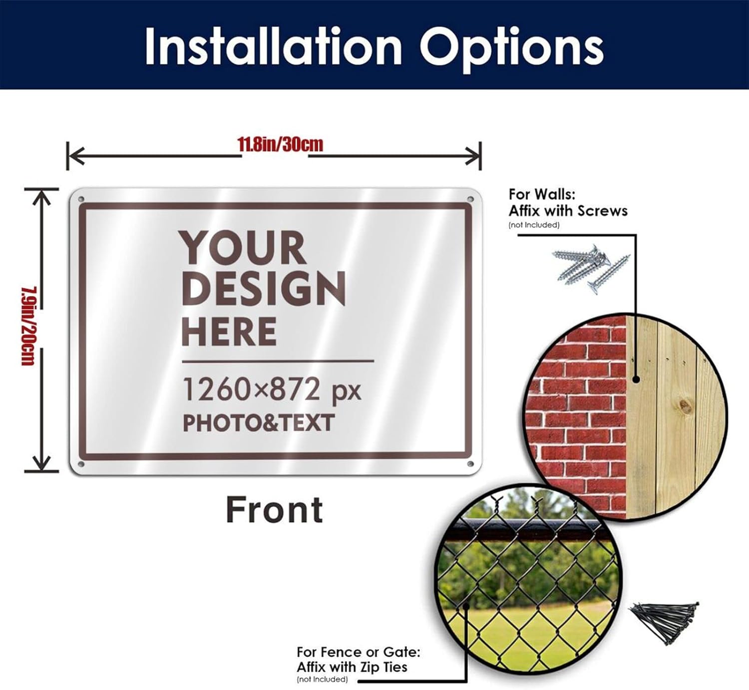 - 12 x 8 inch aluminum custom metal sign with 4 pre-drilled holes on the side that can be easily attached to any surface such as walls, doors or fences with cable ties or screws.
