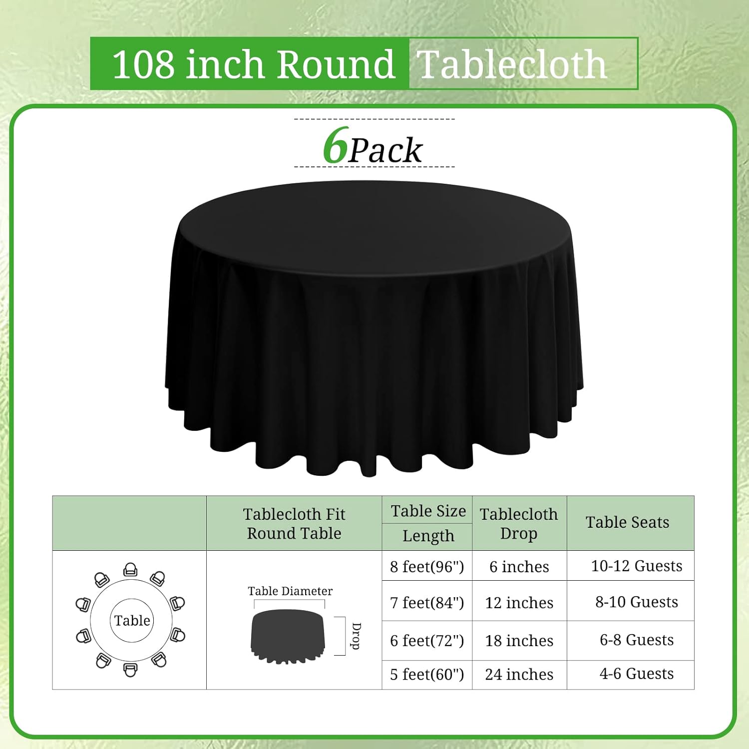 6 Pack Round Tablecloths - 108 Inch, Black Polyester Table Cover for Round Table, Stain and Wrinkle Resistant Washable Fabric Table Cloth, Polyester Tablecloth for Wedding Banquet Parties