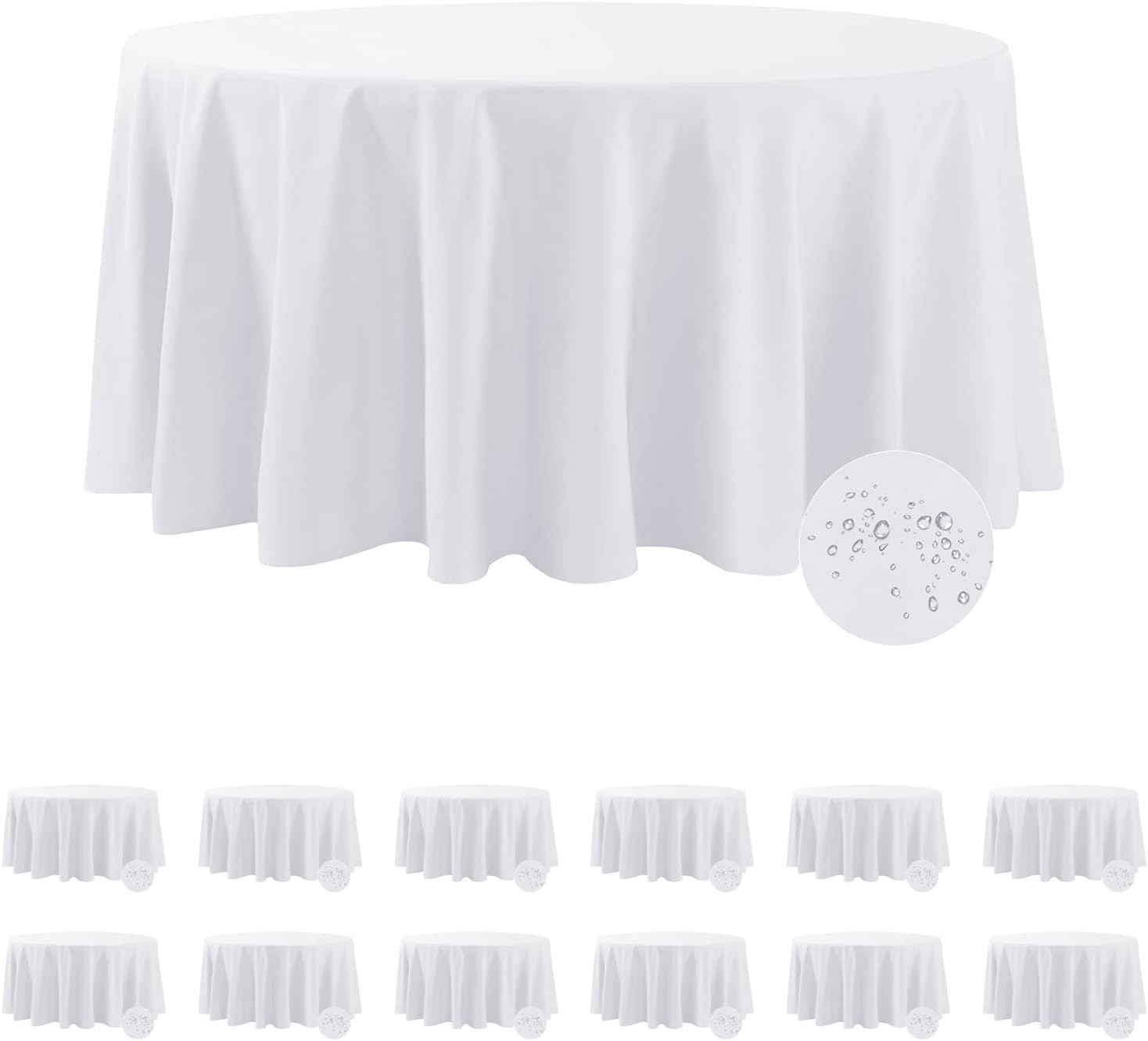 Fokitut 12 Pack Waterproof Round Tablecloth, 120 Inch, Stain Resistant and Wrinkle Polyester Table Cloth, Fabric Table Cover for Kitchen Dining, Wedding, Party, Holiday Dinner-White