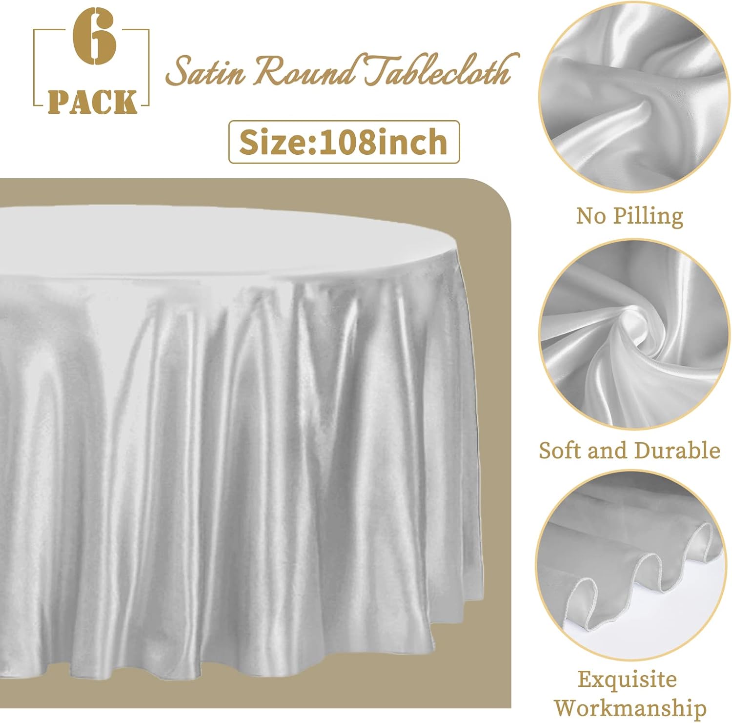 - 【Package Includes】6 Pieces premium silver satin round tablecloth. The size of silk satin table cover is 108 inches. It is suitable for most household rectangular or round tables and can meet your different needs. Sufficient quantities are sufficient for party events to enhance the charm of your event decoration. The tablecloth size is usually larger than your table size. Please measure your table size before buying.