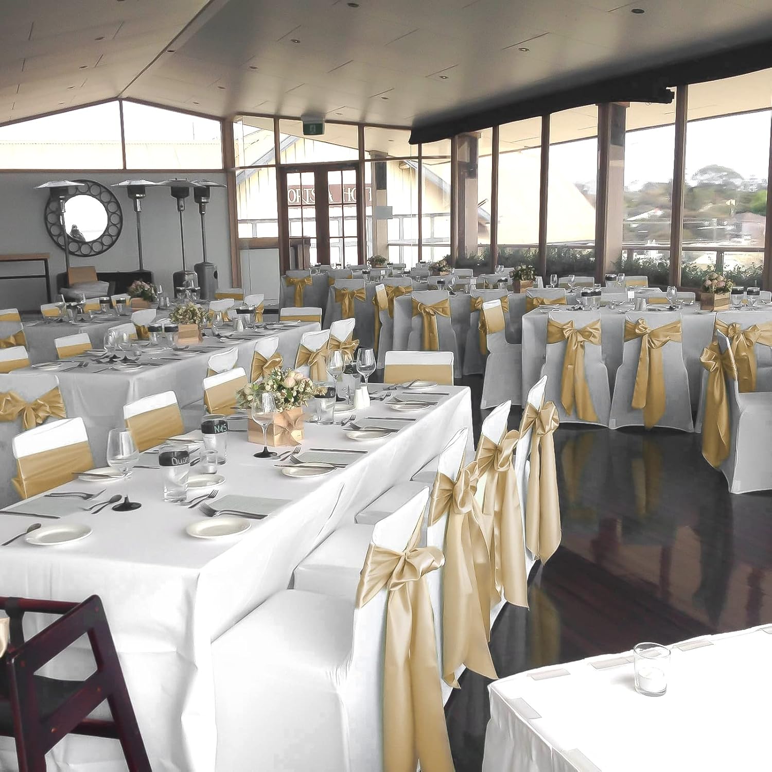 - 🥯【Package Include】Pack of 60 satin chair sash.Size: about 7" x108" or 275cm(l) x 17cm(w). Each package includes chair sashes only, without chair covers.These chair ties bring a modern twist to your chair's settings and let your chairs sparkle brightly. Satin sashes can be tied into wedding chairs, draped across any decoration, or used as attractive table runners.