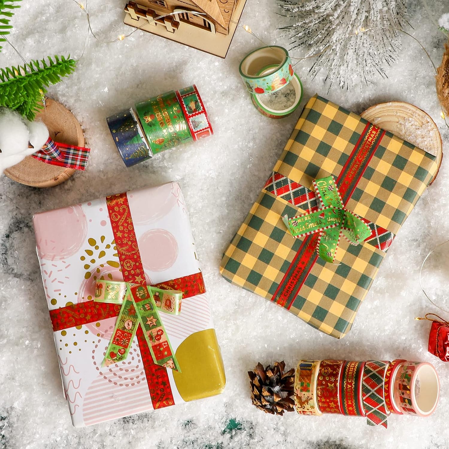 16 Rolls Christmas Washi Tape Holiday Masking Tape 4 Sizes Red Green Christmas Wrapping Tape Glod Foil Decorative Tape for Christmas Scrapbook Journal DIY Craft Gift Wrapping(Christmas