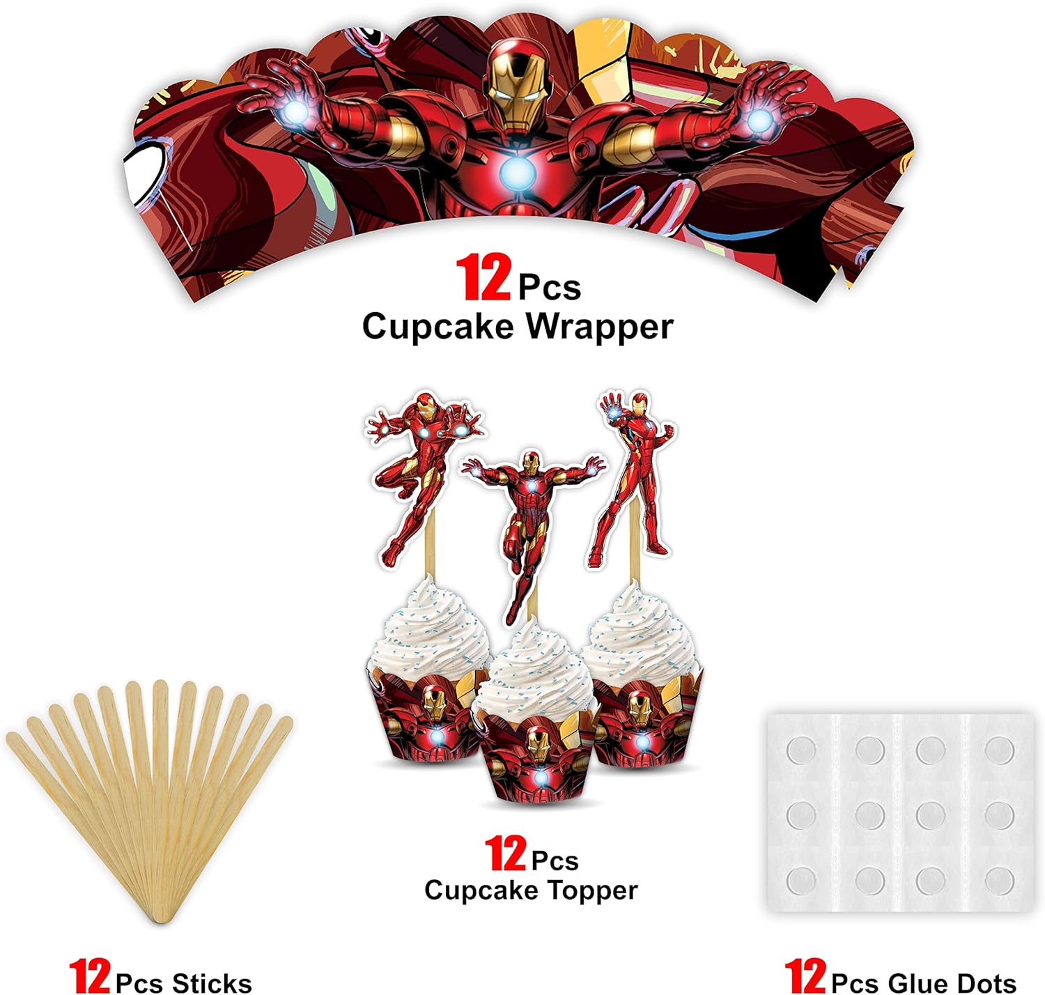 - 🦾 Superhero Theme Cupcake Wrappers – Designed with Irn Man-inspired graphics for an action-packed party look.