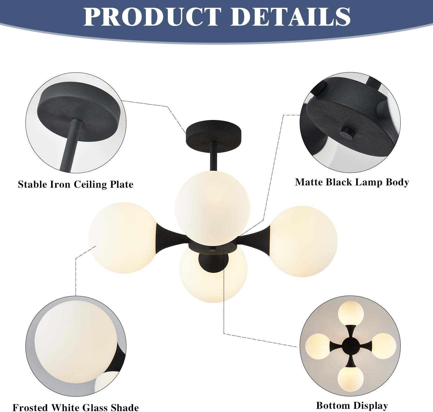 KCO Lighting Mid Century Modern Semi Flush Mount Ceiling Light Fixture Farmhouse Black Globe Sputnik Chandelier Ceiling Light 4-Light Milk Glass Hallway Ceiling Light