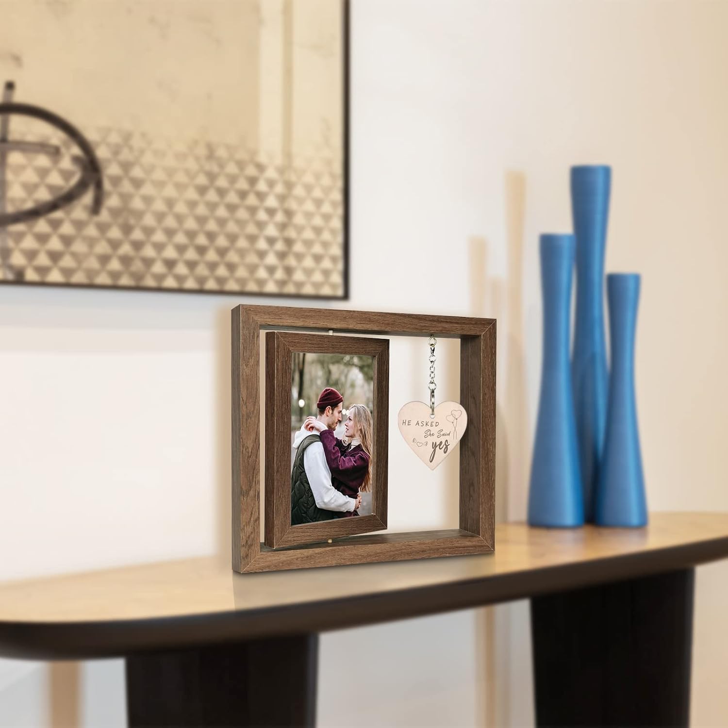 - Rustic Style Decor: The elegant wood background brings a fresh & rustic style that highlights the unique engagement photo frame's simple & earthy colors which match up the heart-etched He Asked She Said Yes quote