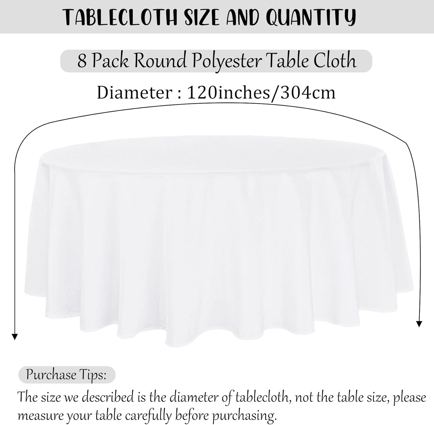 - Package Include: you will get 8 pieces white polyester round tablecloth, enough quantity is suitable for wedding banquets and various parties, the size of each tablecloth is approximately 120 inches / 304 cm, which is large enough to cover 48" to 72" round tables, classic in color and exquisite in design, the solid color makes them suitable for various occasions, instantly heightening the elegance of your table.