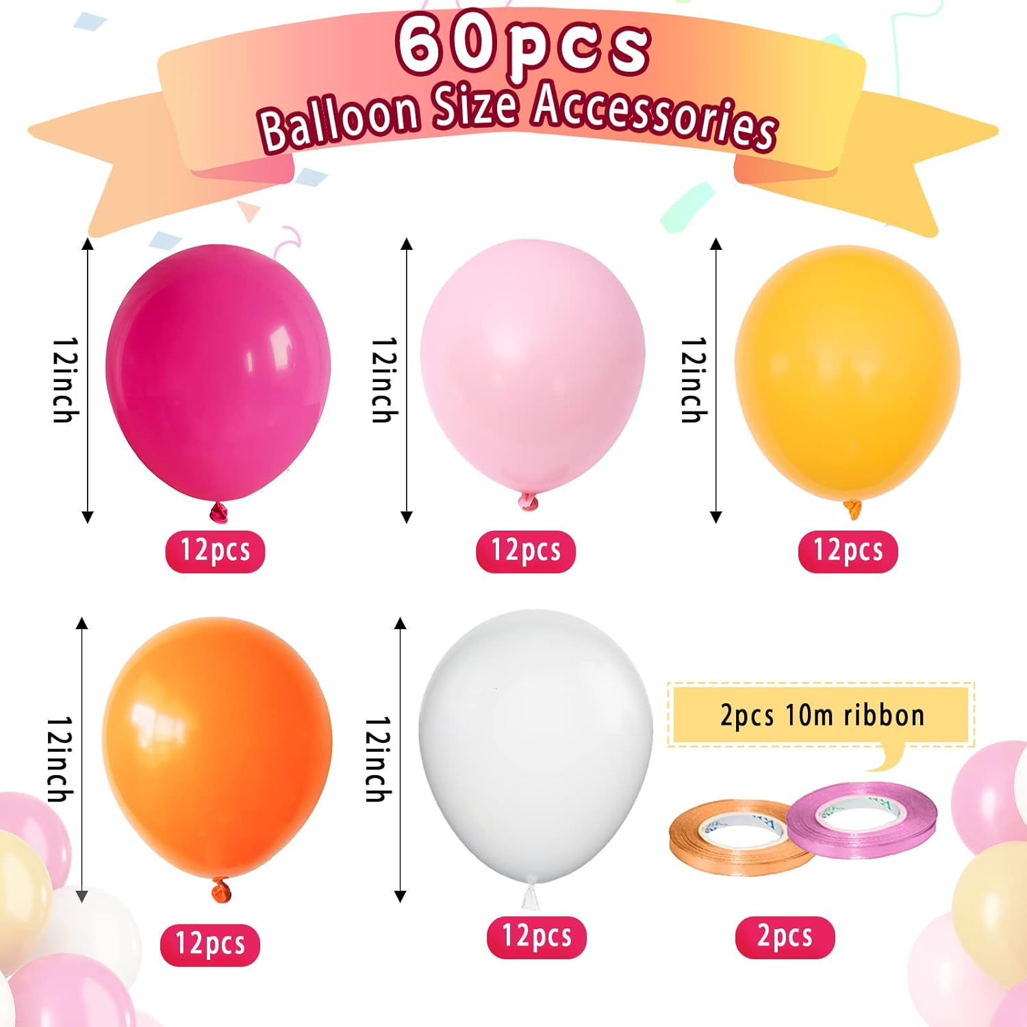 - Mixed Balloons Set: The 12 inch pink and orange balloons set includes 12pcs matte hot pink balloons, 12pcs pastel pink balloons, 12pcs matte yellow balloons, 12pcs matte orange balloons, 12pcs white balloons, 2 roll of ribbon. 62pcs in total. A variety of latex balloons are suitable for your beautiful art theme decoration.