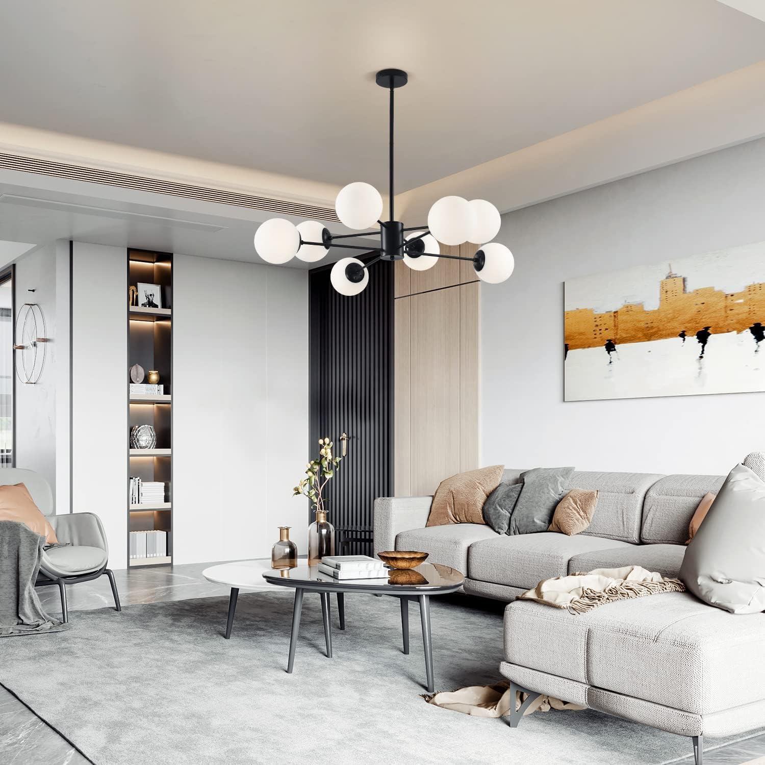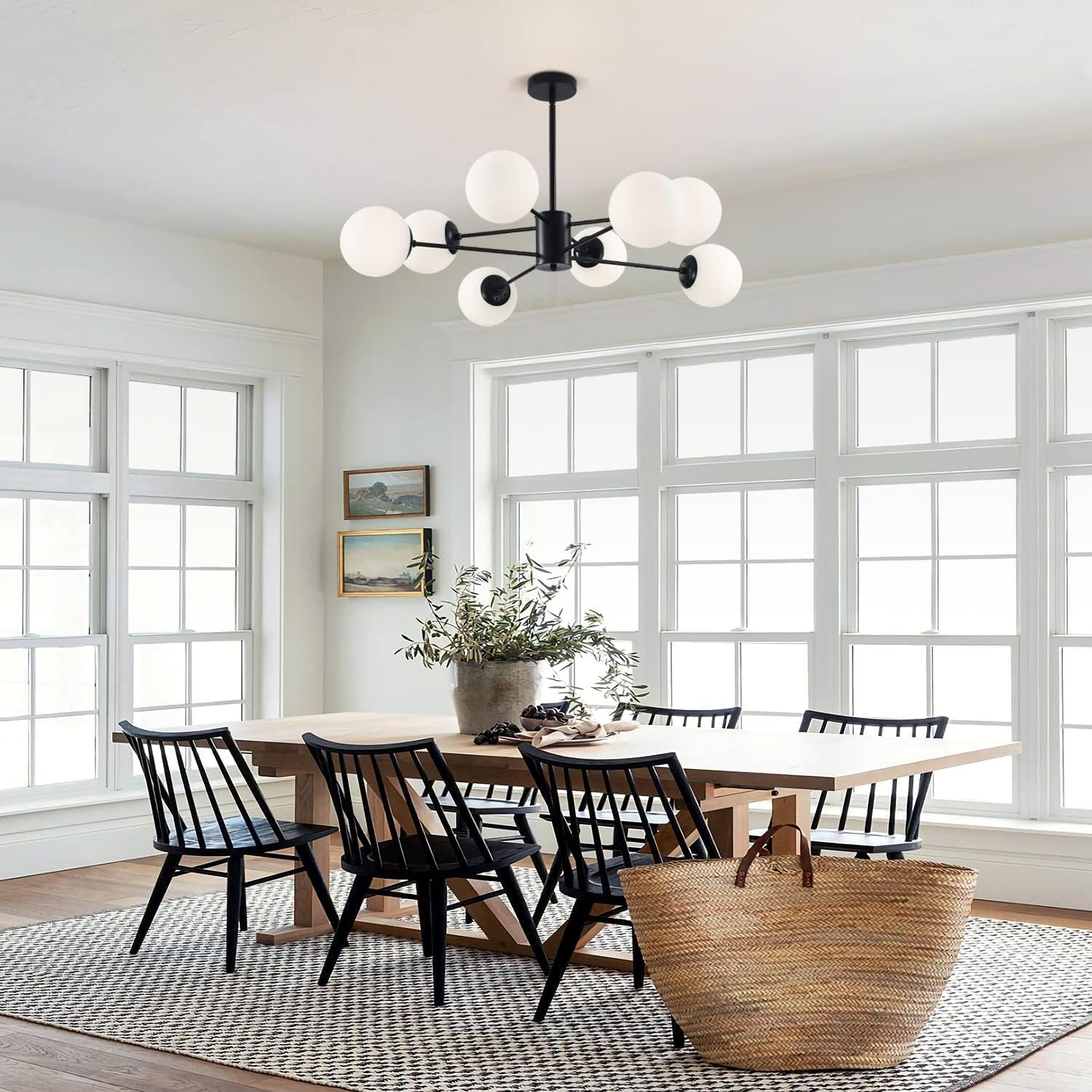 - Mid Century Modern Sputnik Chandelier: The globe chandelier light arm extend out from the center post, milk white glass globe lampshade diffuse the light to create a welcoming glow. Matte black together with frosted white, the whole light fixture is smooth lines, good texture. When it turn on, the lighting will reflect through the glass, adding a romantic, fancy and shining atmosphere to your room