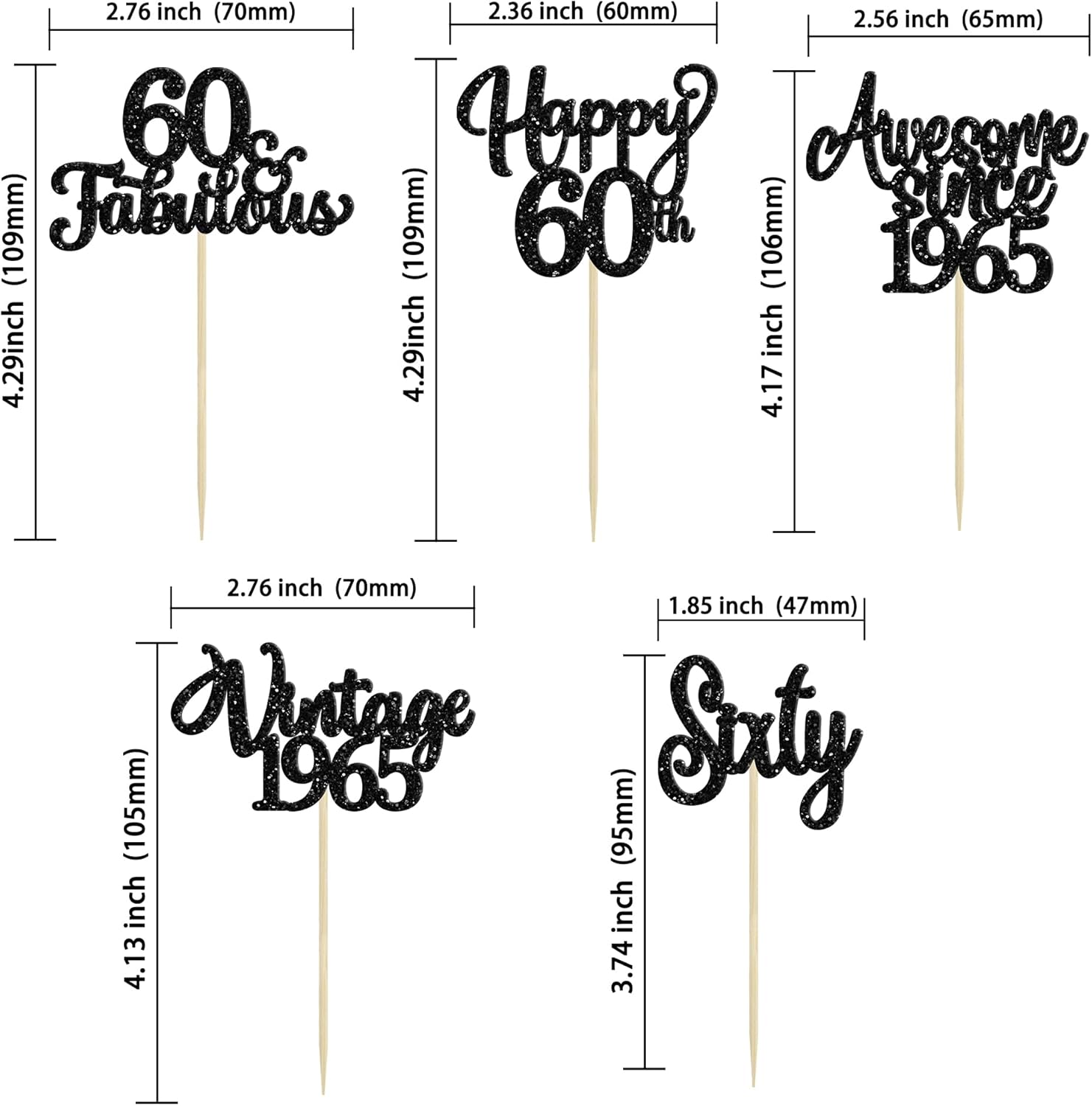 30Pcs Happy 60th Birthday Cupcake Toppers Glitter Sixty Vintage 1965 Cupcake Picks Cheers to 60 Fabulous Cake Decorations for 60th Birthday Wedding Anniversary Party Supplies Black
