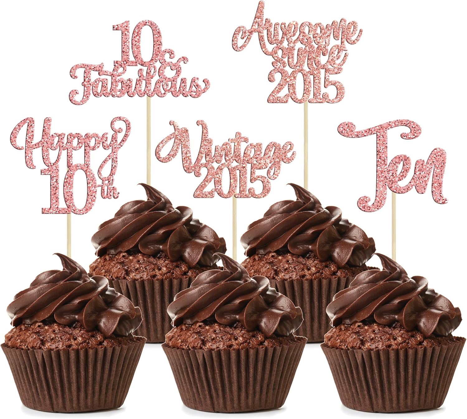 30Pcs Vintage 2015 Cupcake Toppers Glitter Ten 10 Fabulous Happy 10th Birthday Cupcake Picks Cheers to 10 Years for 10th Birthday Anniversary Party Cake Decorations Supplies Rose Gold