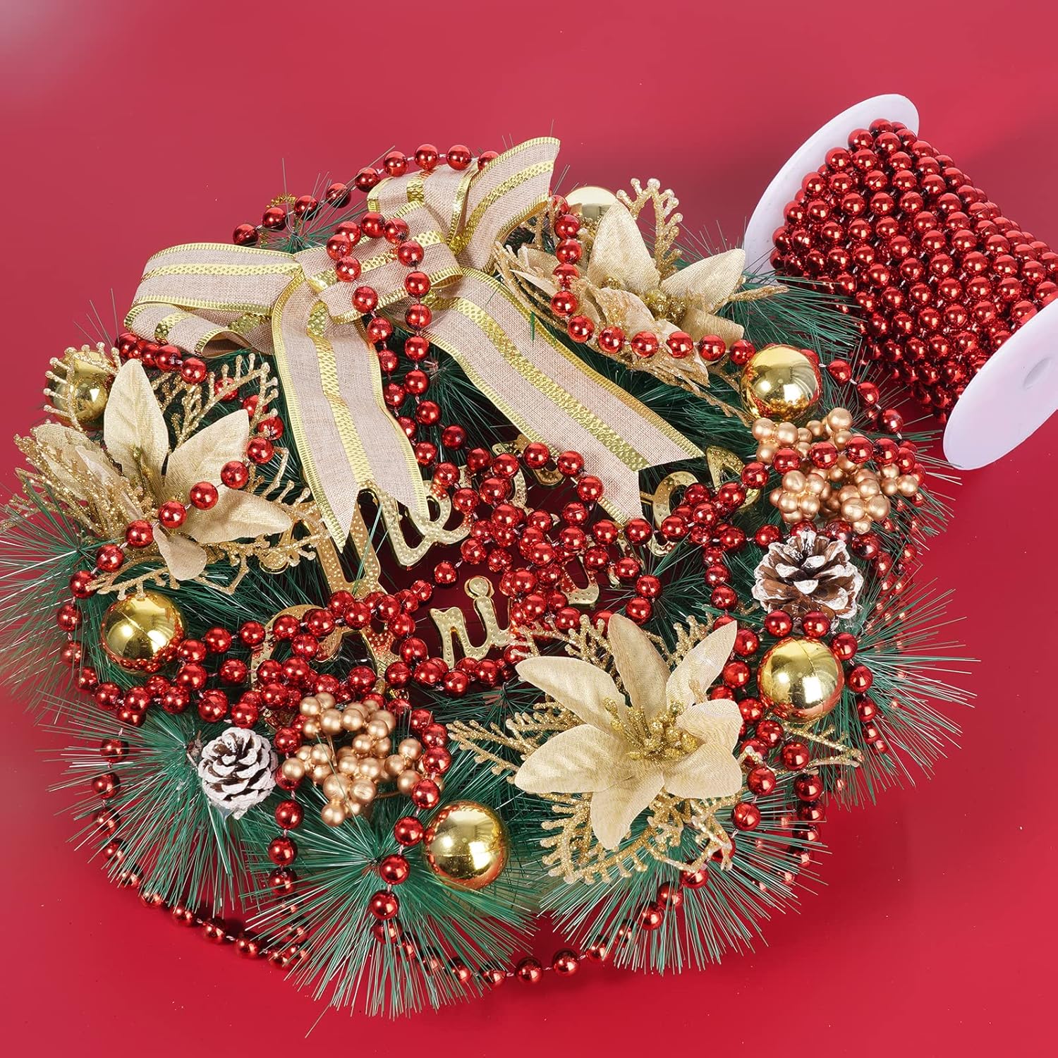 Faux Red Pearl Beads Garland - 10mm Christmas Tree Beads, 11 Yards Red Pearl Strands Spool for Wedding Party & Christmas Tree Decoration