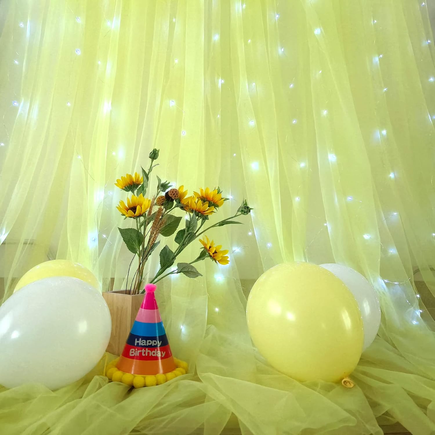 - Products include: 10ft×10ft yellow sheer tulle backdrop curtain, a set of 9.8ft warm white string light and 12pcs Transparent clips (no remote control).