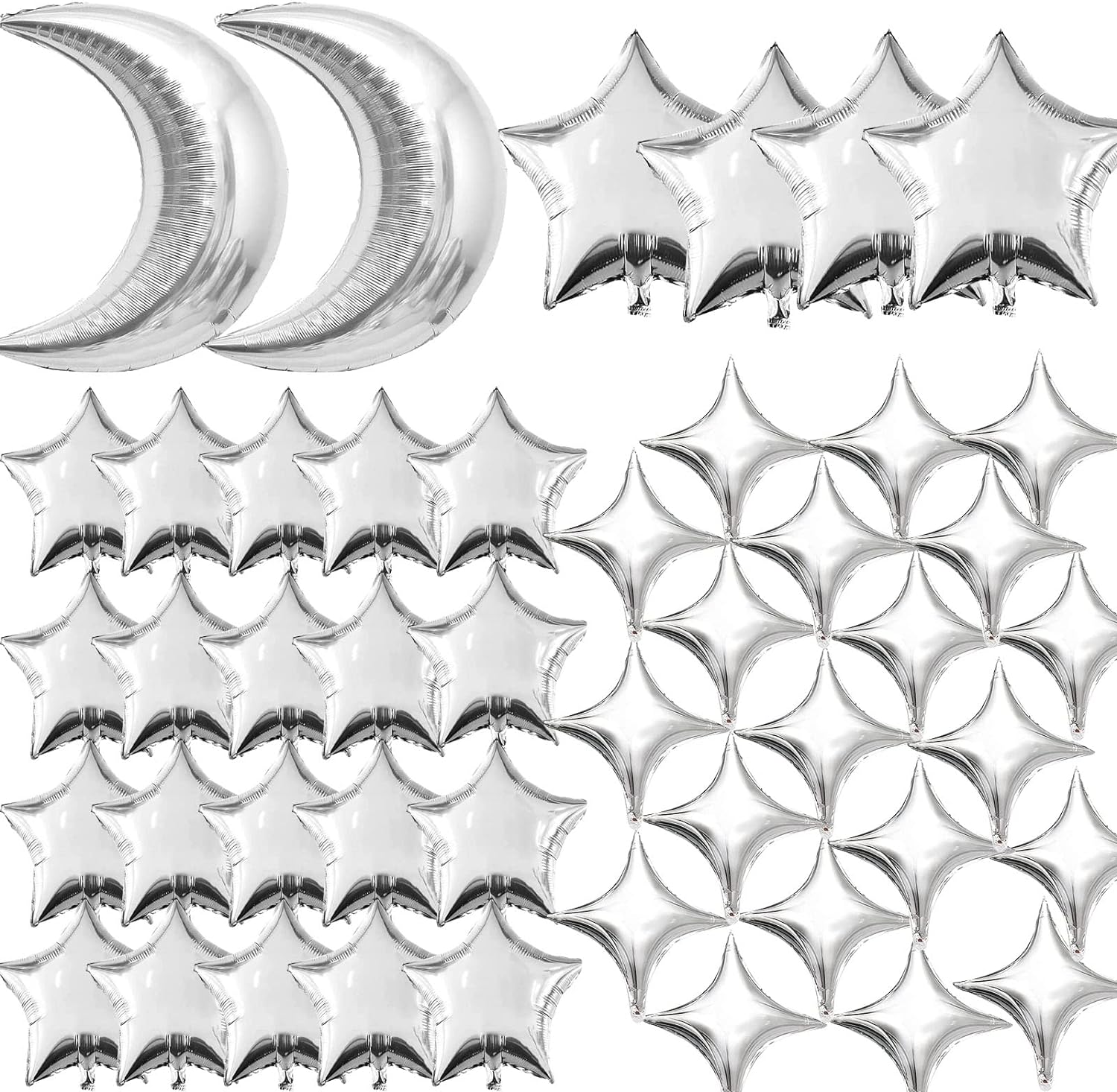 50pcs Silver Moon and Star Balloons,36"Moon Foil Balloons 18"10" Star Foil Balloons Four Pointed Star Balloon Mylar Balloon for Baby Shower Christmas Wedding Birthday Party