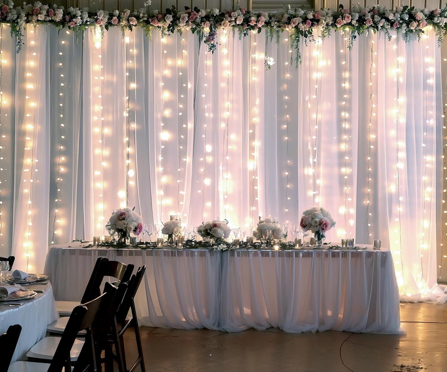 - Sheer backdrop curtains with lights wide range of use : Perfect for wedding backdrops for reception, wedding ceremony, photo booth, baby shower, birthday party, gender reveal, bridal shower, engagement, photography backdrop, photoshoot, graduation, room decorations, candy buffets, dessert tables background, Christmas decorations or anywhere you want.