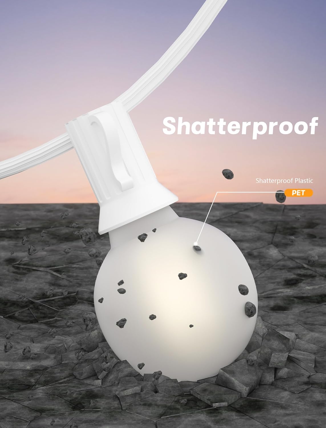 - Waterproof & Durable: With a fully sealed and waterproof design E12 base, G40 globe string lights can withstand rainy, windy, or damp climates, making sure that it is durable for long term use