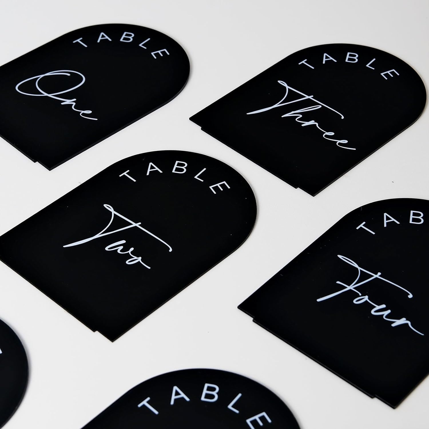 - PREMIUM QUALITY: These black arch acrylic table numbers with stands are made from high quality black acrylic panels and then printed with white letters in a simple arch design that won't go out of style and will last a long time