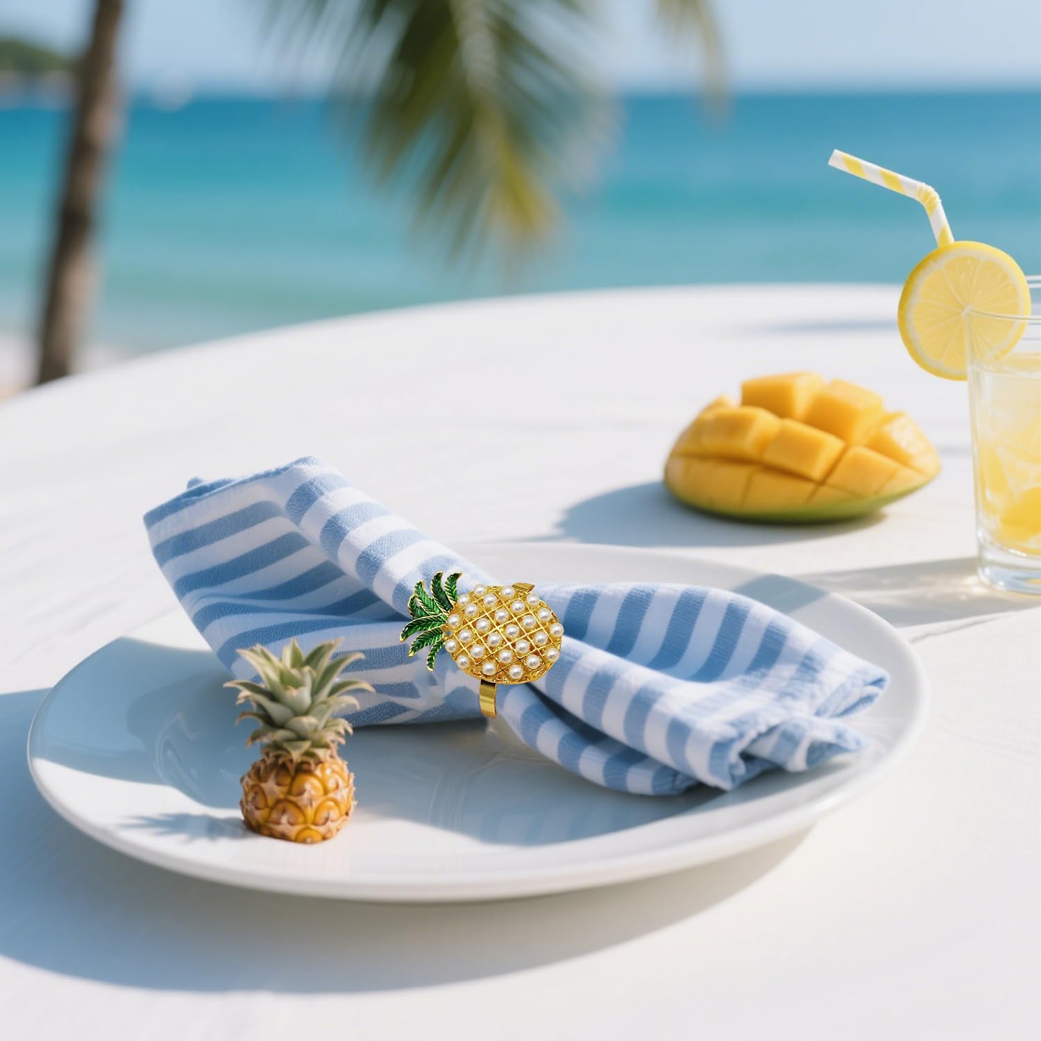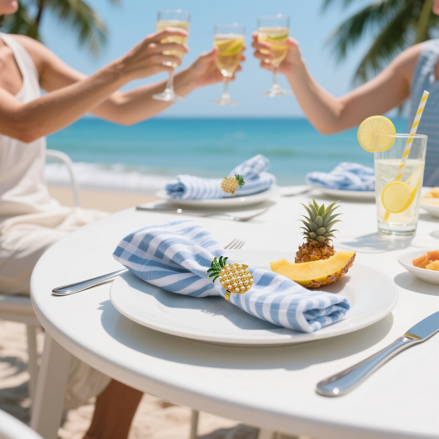 - ✨ Pineapple Design: Cute & Elegant : Make your outdoor parties with tropical napkin rings ! Each gold napkin holders features a pineapple design with pearl and Green leaf,Fresh and lovely,Pearl napkin rings add more vitality to your table,Refresh your kitchen table with elegant napkin rings set of 6 and green rings for Napkins bring you a good mood during dining